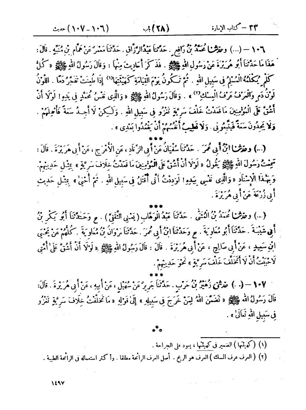 ١٠٦ - (١٨٧٦) وحَدَّثَنَا مُحَمَّدُ بْنُ رَافِعٍ، حَدَّثَنَا عَبْدُ الرَّزَّاقِ، حَدَّثَنَا مَعْمَرٌ، عَنْ هَمَّامِ بْنِ مُنَبِّهٍ، قَالَ: هَذَا مَا حَدَّثَنَا أَبُو هُرَيْرَةَ، عَنْ رَسُولِ اللهِ صَلَّى اللهُ عَلَيْهِ وَسَلَّمَ، فَذَكَرَ أَحَادِيثَ مِنْهَا، وَقَالَ رَسُولُ اللهِ صَلَّى اللهُ عَلَيْهِ وَسَلَّمَ: «كُلُّ كَلْمٍ يُكْلَمُهُ الْمُسْلِمُ فِي سَبِيلِ اللهِ، ثُمَّ تَكُونُ يَوْمَ الْقِيَامَةِ كَهَيْئَتِهَا إِذَا طُعِنَتْ، تَفَجَّرُ دَمًا، اللَّوْنُ لَوْنُ دَمٍ، وَالْعَرْفُ عَرْفُ الْمِسْكِ»