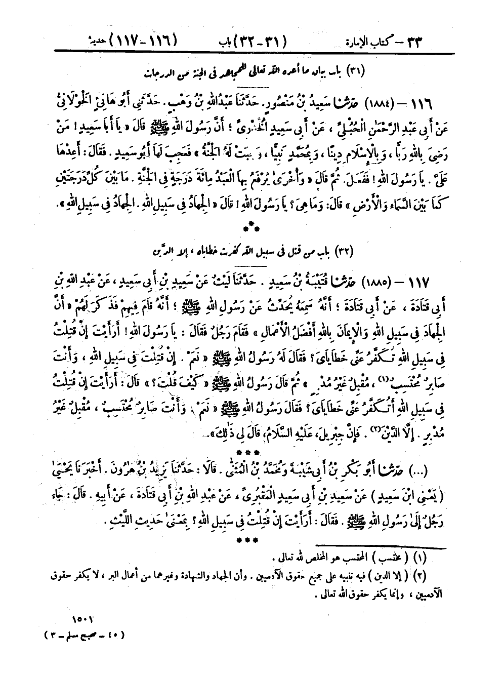 ١١٦ - (١٨٨٤) حَدَّثَنَا سَعِيدُ بْنُ مَنْصُورٍ، حَدَّثَنَا عَبْدُ اللهِ بْنُ وَهْبٍ، حَدَّثَنِي أَبُو هَانِئٍ الْخَوْلَانِيُّ، عَنْ أَبِي عَبْدِ الرَّحْمَنِ الْحُبُلِيِّ، عَنْ أَبِي سَعِيدٍ الْخُدْرِيِّ، أَنَّ رَسُولَ اللهِ صَلَّى اللهُ عَلَيْهِ وَسَلَّمَ قَالَ: «يَا أَبَا سَعِيدٍ، مَنْ رَضِيَ بِاللهِ رَبًّا، وَبِالْإِسْلَامِ دِينًا، وَبِمُحَمَّدٍ نَبِيًّا، وَجَبَتْ لَهُ الْجَنَّةُ»، فَعَجِبَ لَهَا أَبُو سَعِيدٍ، فَقَالَ: أَعِدْهَا عَلَيَّ يَا رَسُولَ اللهِ، فَفَعَلَ، ثُمَّ قَالَ: «وَأُخْرَى يُرْفَعُ بِهَا الْعَبْدُ مِائَةَ دَرَجَةٍ فِي الْجَنَّةِ، مَا بَيْنَ كُلِّ دَرَجَتَيْنِ كَمَا بَيْنَ السَّمَاءِ وَالْأَرْضِ»، قَالَ: وَمَا هِيَ يَا رَسُولَ اللهِ؟ قَالَ: «الْجِهَادُ فِي سَبِيلِ اللهِ، الْجِهَادُ فِي سَبِيلِ اللهِ»