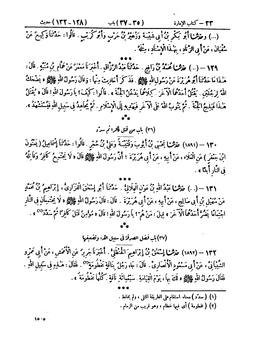 ١٣١ - (١٨٩١) حَدَّثَنَا عَبْدُ اللهِ بْنُ عَوْنٍ الْهِلَالِيُّ، حَدَّثَنَا أَبُو إِسْحَاقَ الْفَزَارِيُّ إِبْرَاهِيمُ بْنُ مُحَمَّدٍ، عَنْ سُهَيْلِ بْنِ أَبِي صَالِحٍ، عَنْ أَبِيهِ، عَنْ أَبِي هُرَيْرَةَ، قَالَ: قَالَ رَسُولُ اللهِ صَلَّى اللهُ عَلَيْهِ وَسَلَّمَ: «لَا يَجْتَمِعَانِ فِي النَّارِ اجْتِمَاعًا يَضُرُّ أَحَدُهُمَا الْآخَرَ»، قِيلَ: مَنْ هُمْ يَا رَسُولَ اللهِ؟ قَالَ: «مُؤْمِنٌ قَتَلَ كَافِرًا، ثُمَّ سَدَّدَ»