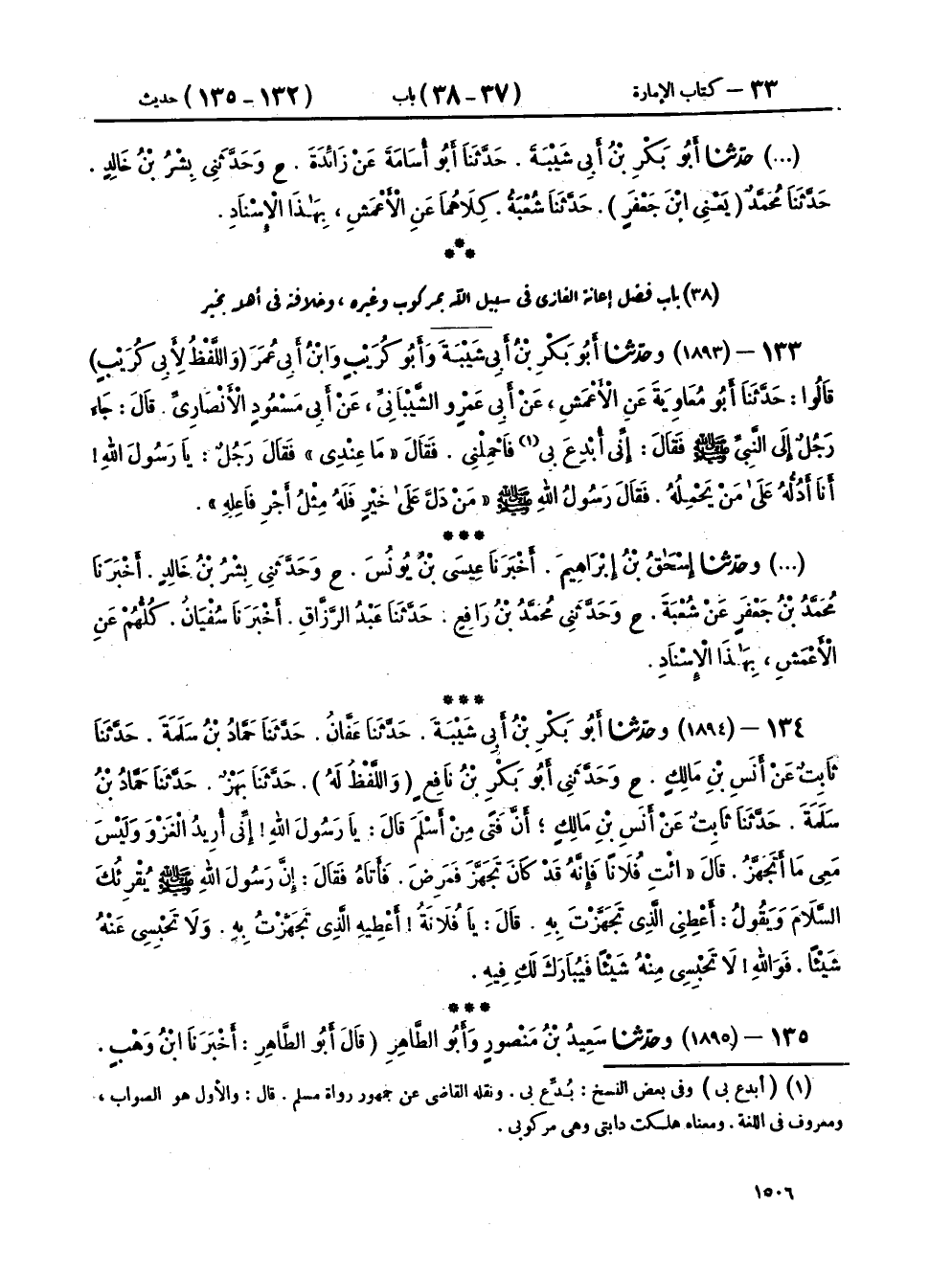 ١٣٣ - (١٨٩٣) وحَدَّثَنَا أَبُو بَكْرِ بْنُ أَبِي شَيْبَةَ، وَأَبُو كُرَيْبٍ، وَابْنُ أَبِي عُمَرَ، وَاللَّفْظُ لِأَبِي كُرَيْبٍ، قَالُوا: حَدَّثَنَا أَبُو مُعَاوِيَةَ، عَنِ الْأَعْمَشِ، عَنْ أَبِي عَمْرٍو الشَّيْبَانِيِّ، عَنْ أَبِي مَسْعُودٍ الْأَنْصَارِيِّ، قَالَ: جَاءَ رَجُلٌ إِلَى النَّبِيِّ صَلَّى اللهُ عَلَيْهِ وَسَلَّمَ، فَقَالَ: إِنِّي أُبْدِعَ بِي فَاحْمِلْنِي، فَقَالَ: «مَا عِنْدِي»، فَقَالَ رَجُلٌ: يَا رَسُولَ اللهِ، أَنَا أَدُلُّهُ عَلَى مَنْ يَحْمِلُهُ، فَقَالَ رَسُولُ اللهِ صَلَّى اللهُ عَلَيْهِ وَسَلَّمَ: «مَنْ دَلَّ عَلَى خَيْرٍ فَلَهُ مِثْلُ أَجْرِ فَاعِلِهِ»،