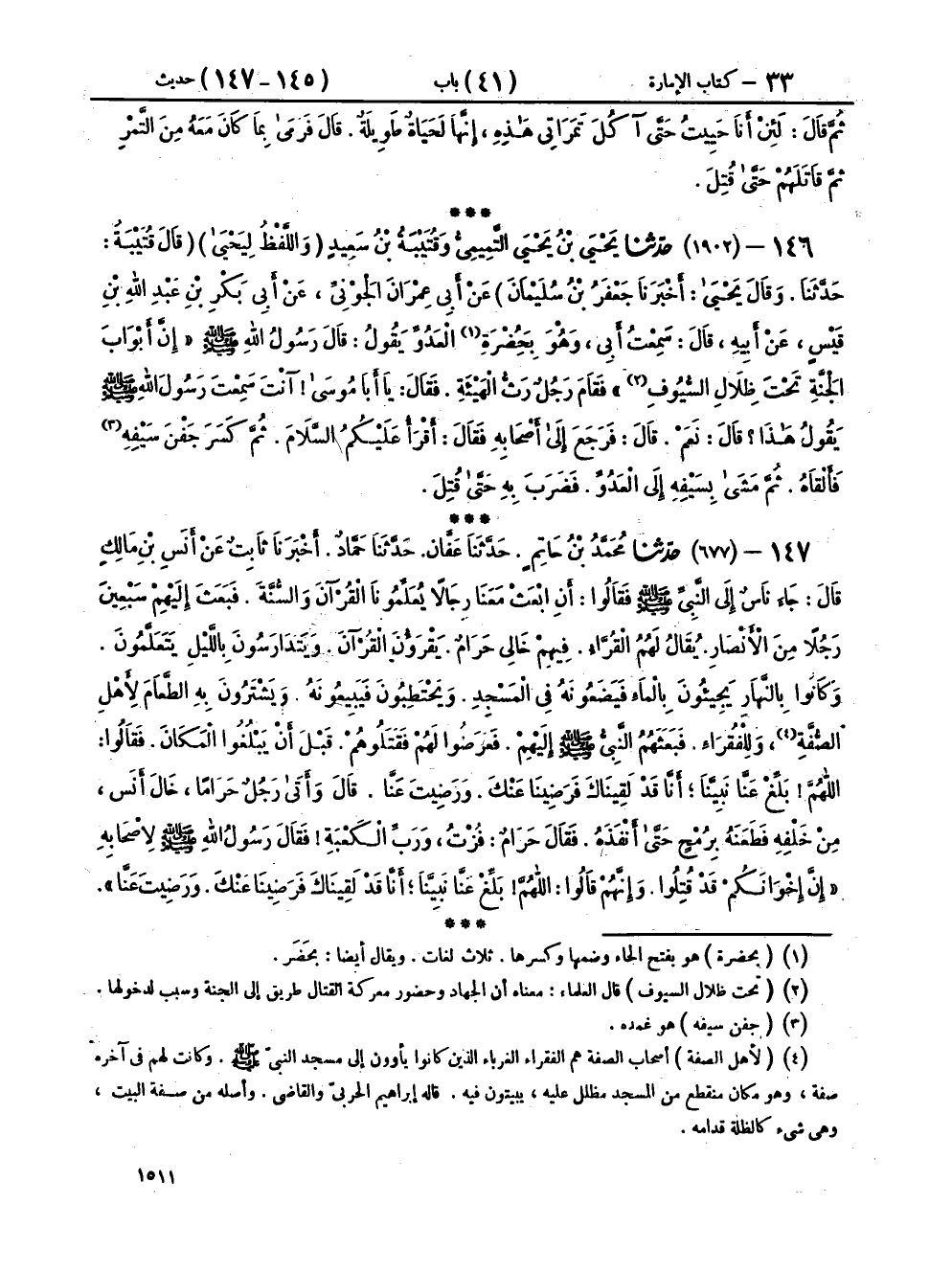 ١٤٦ - (١٩٠٢) حَدَّثَنَا يَحْيَى بْنُ يَحْيَى التَّمِيمِيُّ، وَقُتَيْبَةُ بْنُ سَعِيدٍ، وَاللَّفْظُ لِيَحْيَى، قَالَ قُتَيْبَةُ: حَدَّثَنَا، وقَالَ يَحْيَى: أَخْبَرَنَا جَعْفَرُ بْنُ سُلَيْمَانَ، عَنْ أَبِي عِمْرَانَ الْجَوْنِيِّ، عَنْ أَبِي بَكْرِ بْنِ عَبْدِ اللهِ بْنِ قَيْسٍ، عَنْ أَبِيهِ، قَالَ: سَمِعْتُ أَبِي، وَهُوَ بِحَضْرَةِ الْعَدُوِّ، يَقُولُ: قَالَ رَسُولُ اللهِ صَلَّى اللهُ عَلَيْهِ وَسَلَّمَ: «إِنَّ أَبْوَابَ الْجَنَّةِ تَحْتَ ظِلَالِ السُّيُوفِ»، فَقَامَ رَجُلٌ رَثُّ الْهَيْئَةِ، فَقَالَ: يَا أَبَا مُوسَى، آنْتَ سَمِعْتَ رَسُولَ اللهِ صَلَّى اللهُ عَلَيْهِ وَسَلَّمَ يَقُولُ هَذَا؟ قَالَ: نَعَمْ، قَالَ: " فَرَجَعَ إِلَى أَصْحَابِهِ، فَقَالَ: أَقْرَأُ عَلَيْكُمُ السَّلَامَ، ثُمَّ كَسَرَ جَفْنَ سَيْفِهِ فَأَلْقَاهُ، ثُمَّ مَشَى بِسَيْفِهِ إِلَى الْعَدُوِّ فَضَرَبَ بِهِ حَتَّى قُتِلَ "