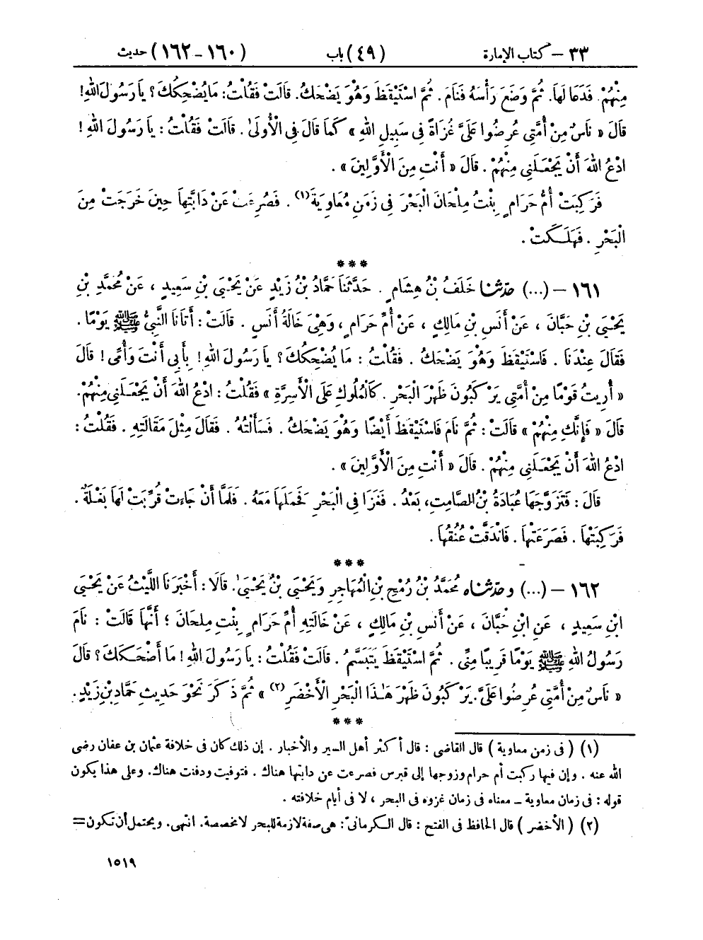١٦١ - (١٩١٢) حَدَّثَنَا خَلَفُ بْنُ هِشَامٍ، حَدَّثَنَا حَمَّادُ بْنُ زَيْدٍ، عَنْ يَحْيَى بْنِ سَعِيدٍ، عَنْ مُحَمَّدِ بْنِ يَحْيَى بْنِ حَبَّانَ، عَنْ أَنَسِ بْنِ مَالِكٍ، عَنْ أُمِّ حَرَامٍ، وَهِيَ خَالَةُ أَنَسٍ، قَالَتْ: أَتَانَا النَّبِيُّ صَلَّى اللهُ عَلَيْهِ وَسَلَّمَ يَوْمًا، فَقَالَ عِنْدَنَا، فَاسْتَيْقَظَ وَهُوَ يَضْحَكُ، فَقُلْتُ: مَا يُضْحِكُكَ يَا رَسُولَ اللهِ؟ بِأَبِي أَنْتَ وَأُمِّي، قَالَ: «أُرِيتُ قَوْمًا مِنْ أُمَّتِي يَرْكَبُونَ ظَهْرَ الْبَحْرِ كَالْمُلُوكِ عَلَى الْأَسِرَّةِ»، فَقُلْتُ: ادْعُ اللهَ أَنْ يَجْعَلَنِي مِنْهُمْ، قَالَ: «فَإِنَّكِ مِنْهُمْ»، قَالَتْ: ثُمَّ نَامَ، فَاسْتَيْقَظَ أَيْضًا وَهُوَ يَضْحَكُ، فَسَأَلْتُهُ، فَقَالَ مِثْلَ مَقَالَتِهِ، فَقُلْتُ: ادْعُ اللهَ أَنْ يَجْعَلَنِي مِنْهُمْ، قَالَ: «أَنْتِ مِنَ الْأَوَّلِينَ»، قَالَ: فَتَزَوَّجَهَا عُبَادَةُ بْنُ الصَّامِتِ بَعْدُ، فَغَزَا فِي الْبَحْرِ فَحَمَلَهَا مَعَهُ، فَلَمَّا أَنْ جَاءَتْ قُرِّبَتْ لَهَا بَغْلَةٌ فَرَكِبَتْهَا فَصَرَعَتْهَا، فَانْدَقَّتْ عُنُقُهَا،