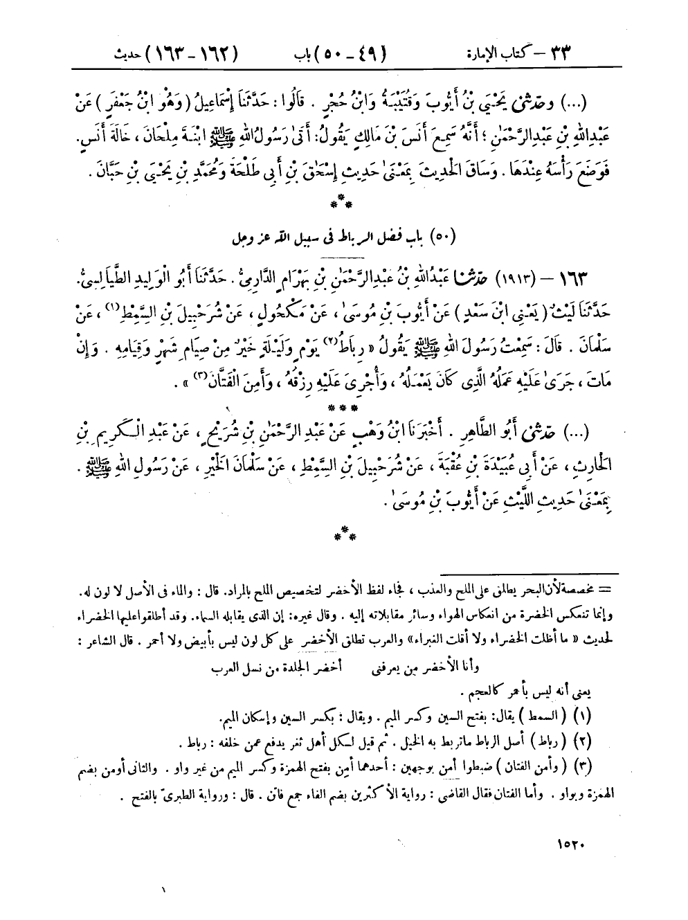 ١٦٣ - (١٩١٣) حَدَّثَنَا عَبْدُ اللهِ بْنُ عَبْدِ الرَّحْمَنِ بْنِ بَهْرَامَ الدَّارِمِيُّ، حَدَّثَنَا أَبُو الْوَلِيدِ الطَّيَالِسِيُّ، حَدَّثَنَا لَيْثٌ يَعْنِي ابْنَ سَعْدٍ، عَنْ أَيُّوبَ بْنِ مُوسَى، عَنْ مَكْحُولٍ، عَنْ شُرَحْبِيلَ بْنِ السِّمْطِ، عَنْ سَلْمَانَ، قَالَ: سَمِعْتُ رَسُولَ اللهِ صَلَّى اللهُ عَلَيْهِ وَسَلَّمَ يَقُولُ: «رِبَاطُ يَوْمٍ وَلَيْلَةٍ خَيْرٌ مِنْ صِيَامِ شَهْرٍ وَقِيَامِهِ، وَإِنْ مَاتَ جَرَى عَلَيْهِ عَمَلُهُ الَّذِي كَانَ يَعْمَلُهُ، وَأُجْرِيَ عَلَيْهِ رِزْقُهُ، وَأَمِنَ الْفَتَّانَ»،