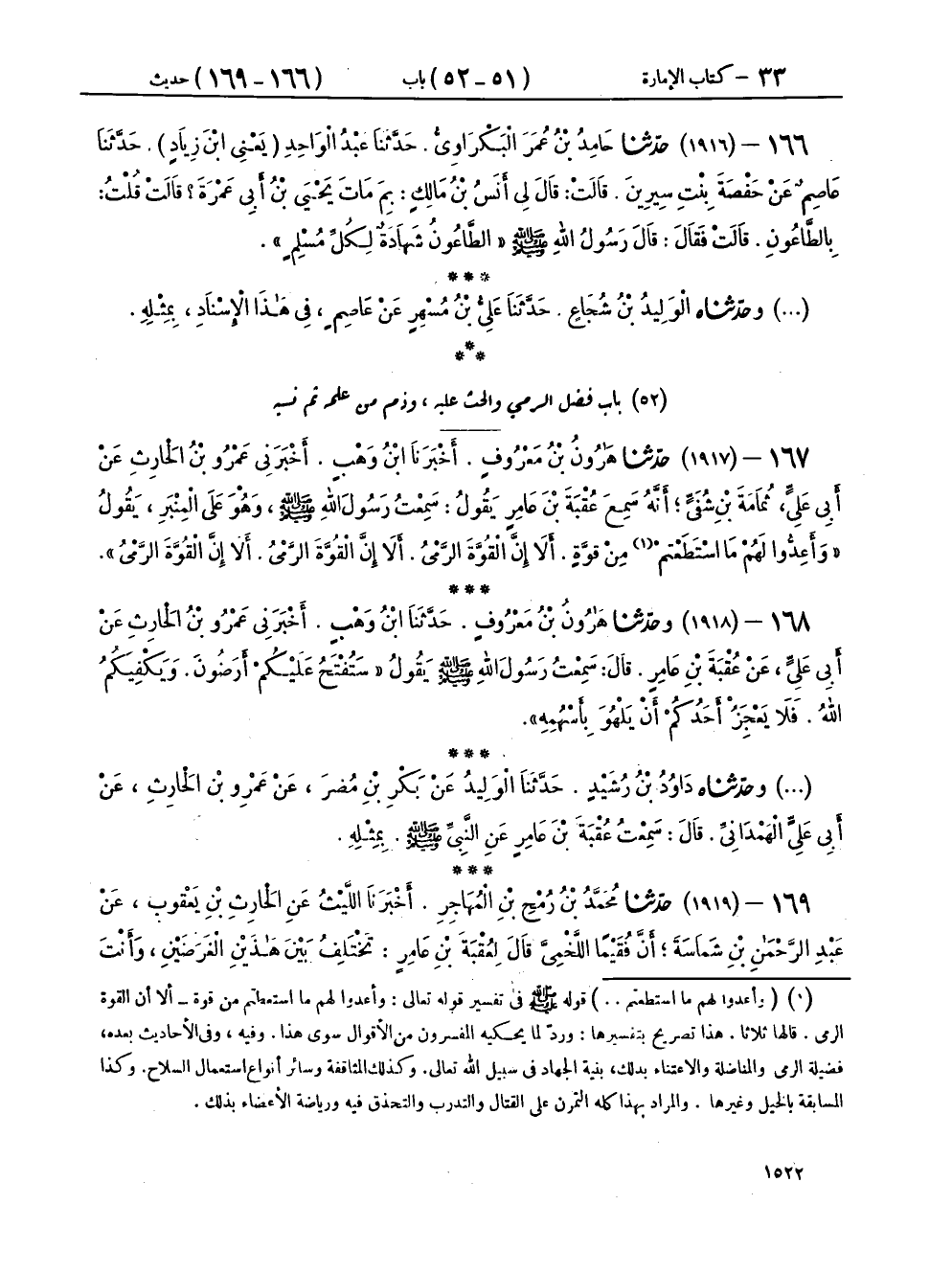 ١٦٧ - (١٩١٧) حَدَّثَنَا هَارُونُ بْنُ مَعْرُوفٍ، أَخْبَرَنَا ابْنُ وَهْبٍ، أَخْبَرَنِي عَمْرُو بْنُ الْحَارِثِ، عَنْ أَبِي عَلِيٍّ ثُمَامَةَ بْنِ شُفَيٍّ، أَنَّهُ سَمِعَ عُقْبَةَ بْنَ عَامِرٍ، يَقُولُ: سَمِعْتُ رَسُولَ اللهِ صَلَّى اللهُ عَلَيْهِ وَسَلَّمَ وَهُوَ عَلَى الْمِنْبَرِ، يَقُولُ: " {وَأَعِدُّوا لَهُمْ مَا اسْتَطَعْتُمْ مِنْ قُوَّةٍ} [الأنفال: ٦٠]، أَلَا إِنَّ الْقُوَّةَ الرَّمْيُ، أَلَا إِنَّ الْقُوَّةَ الرَّمْيُ، أَلَا إِنَّ الْقُوَّةَ الرَّمْيُ "