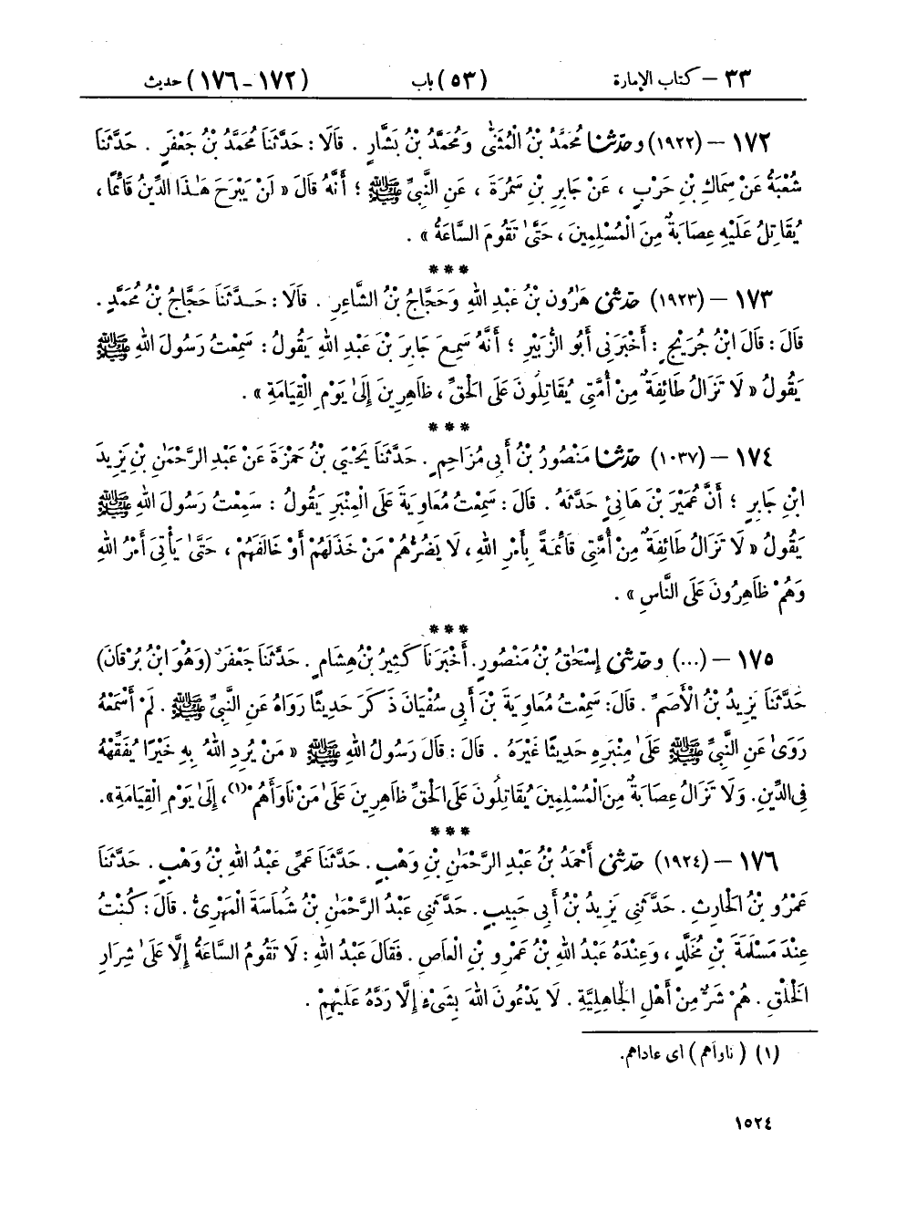 ١٧٢ - (١٩٢٢) وحَدَّثَنَا مُحَمَّدُ بْنُ الْمُثَنَّى، وَمُحَمَّدُ بْنُ بَشَّارٍ، قَالَا: حَدَّثَنَا مُحَمَّدُ بْنُ جَعْفَرٍ، حَدَّثَنَا شُعْبَةُ، عَنْ سِمَاكِ بْنِ حَرْبٍ، عَنْ جَابِرِ بْنِ سَمُرَةَ، عَنِ النَّبِيِّ صَلَّى اللهُ عَلَيْهِ وَسَلَّمَ أَنَّهُ قَالَ: «لَنْ يَبْرَحَ هَذَا الدِّينُ قَائِمًا، يُقَاتِلُ عَلَيْهِ عِصَابَةٌ مِنَ الْمُسْلِمِينَ، حَتَّى تَقُومَ السَّاعَةُ»