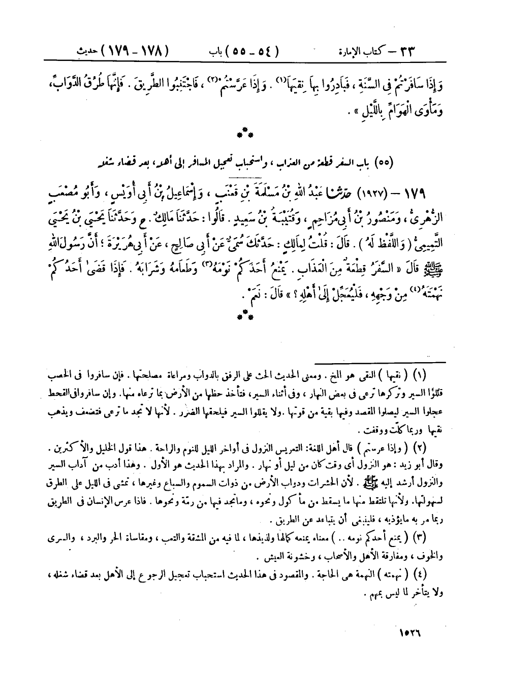 ١٧٩ - (١٩٢٧) حَدَّثَنَا عَبْدُ اللهِ بْنُ مَسْلَمَةَ بْنِ قَعْنَبٍ، وَإِسْمَاعِيلُ بْنُ أَبِي أُوَيْسٍ، وَأَبُو مُصْعَبٍ الزُّهْرِيُّ، وَمَنْصُورُ بْنُ أَبِي مُزَاحِمٍ، وَقُتَيْبَةُ بْنُ سَعِيدٍ، قَالُوا: حَدَّثَنَا مَالِكٌ، ح وحَدَّثَنَا يَحْيَى بْنُ يَحْيَى التَّمِيمِيُّ، وَاللَّفْظُ لَهُ، قَالَ: قُلْتُ لِمَالِكٍ، حَدَّثَكَ سُمَيٌّ، عَنْ أَبِي صَالِحٍ، عَنْ أَبِي هُرَيْرَةَ، أَنَّ رَسُولَ اللهِ صَلَّى اللهُ عَلَيْهِ وَسَلَّمَ قَالَ: «السَّفَرُ قِطْعَةٌ مِنَ الْعَذَابِ، يَمْنَعُ أَحَدَكُمْ نَوْمَهُ وَطَعَامَهُ وَشَرَابَهُ، فَإِذَا قَضَى أَحَدُكُمْ نَهْمَتَهُ مِنْ وَجْهِهِ، فَلْيُعَجِّلْ إِلَى أَهْلِهِ»، قَالَ: نَعَمْ