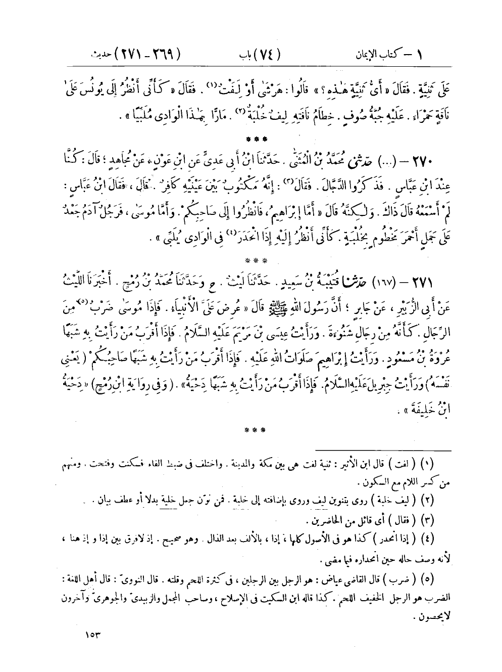 ٢٧١ - (١٦٧) حَدَّثَنَا قُتَيْبَةُ بْنُ سَعِيدٍ، حَدَّثَنَا لَيْثٌ، ح، وَحَدَّثَنَا مُحَمَّدُ بْنُ رُمْحٍ، أَخْبَرَنَا اللَّيْثُ، عَنْ أَبِي الزُّبَيْرِ، عَنْ جَابِرٍ، أَنَّ رَسُولَ اللهِ صَلَّى اللهُ عَلَيْهِ وَسَلَّمَ قَالَ: «عُرِضَ عَلَيَّ الْأَنْبِيَاءُ، فَإِذَا مُوسَى ضَرْبٌ مِنَ الرِّجَالِ، كَأَنَّهُ مِنْ رِجَالِ شَنُوءَةَ، وَرَأَيْتُ عِيسَى ابْنَ مَرْيَمَ عَلَيْهِ السَّلَامُ، فَإِذَا أَقْرَبُ مَنْ رَأَيْتُ بِهِ شَبَهًا عُرْوَةُ بْنُ مَسْعُودٍ، وَرَأَيْتُ إِبْرَاهِيمَ صَلَوَاتُ اللهِ عَلَيْهِ، فَإِذَا أَقْرَبُ مَنْ رَأَيْتُ بِهِ شَبَهًا صَاحِبُكُمْ - يَعْنِي نَفْسَهُ -، وَرَأَيْتُ جِبْرِيلَ عَلَيْهِ السَّلَامُ، فَإِذَا أَقْرَبُ مَنْ رَأَيْتُ بِهِ شَبَهًا دَحْيَةُ» وَفِي رِوَايَةِ ابْنِ رُمْحٍ: «دَحْيَةُ بْنُ خَلِيفَةَ»