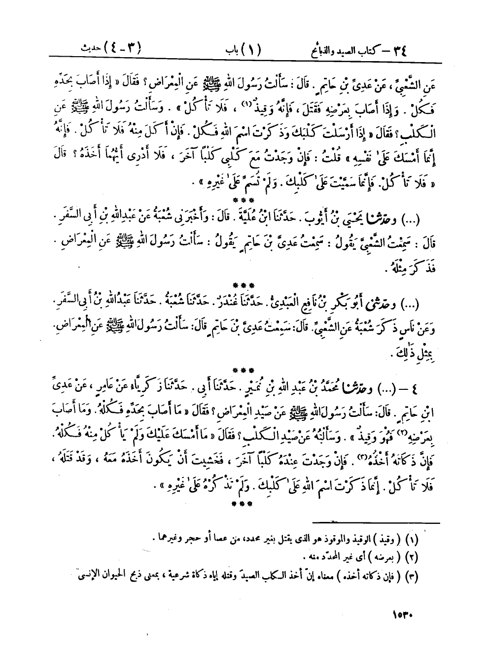 ٤ - (١٩٢٩) وحَدَّثَنَا مُحَمَّدُ بْنُ عَبْدِ اللهِ بْنِ نُمَيْرٍ، حَدَّثَنَا أَبِي، حَدَّثَنَا زَكَرِيَّا، عَنْ عَامِرٍ، عَنْ عَدِيِّ بْنِ حَاتِمٍ، قَالَ: سَأَلْتُ رَسُولَ اللهِ صَلَّى اللهُ عَلَيْهِ وَسَلَّمَ، عَنْ صَيْدِ الْمِعْرَاضِ، فَقَالَ: «مَا أَصَابَ بِحَدِّهِ فَكُلْهُ، وَمَا أَصَابَ بِعَرْضِهِ فَهُوَ وَقِيذٌ»، وَسَأَلْتُهُ عَنْ صَيْدِ الْكَلْبِ، فَقَالَ: «مَا أَمْسَكَ عَلَيْكَ وَلَمْ يَأْكُلْ مِنْهُ فَكُلْهُ، فَإِنَّ ذَكَاتَهُ أَخْذُهُ، فَإِنْ وَجَدْتَ عِنْدَهُ كَلْبًا آخَرَ، فَخَشِيتَ أَنْ يَكُونَ أَخَذَهُ مَعَهُ وَقَدْ قَتَلَهُ، فَلَا تَأْكُلْ، إِنَّمَا ذَكَرْتَ اسْمَ اللهِ عَلَى كَلْبِكَ، وَلَمْ تَذْكُرْهُ عَلَى غَيْرِهِ»،