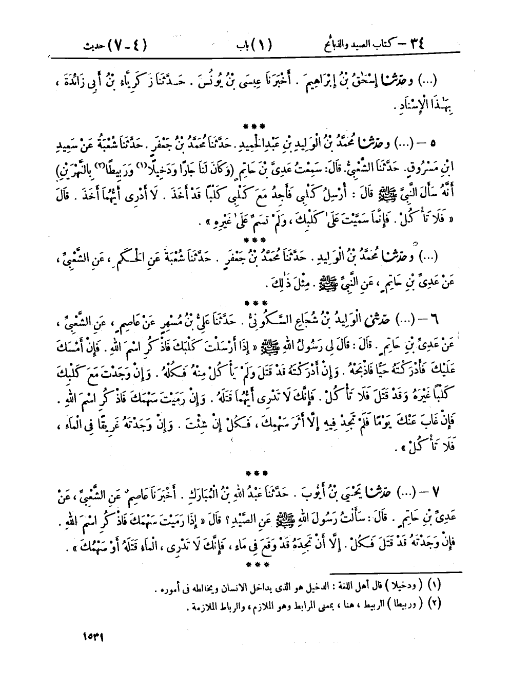 ٦ - (١٩٢٩) حَدَّثَنِي الْوَلِيدُ بْنُ شُجَاعٍ السَّكُونِيُّ، حَدَّثَنَا عَلِيُّ بْنُ مُسْهِرٍ، عَنْ عَاصِمٍ، عَنِ الشَّعْبِيِّ، عَنْ عَدِيِّ بْنِ حَاتِمٍ، قَالَ: قَالَ لِي رَسُولُ اللهِ صَلَّى اللهُ عَلَيْهِ وَسَلَّمَ: «إِذَا أَرْسَلْتَ كَلْبَكَ فَاذْكُرِ اسْمَ اللهِ، فَإِنْ أَمْسَكَ عَلَيْكَ، فَأَدْرَكْتَهُ حَيًّا فَاذْبَحْهُ، وَإِنْ أَدْرَكْتَهُ قَدْ قَتَلَ، وَلَمْ يَأْكُلْ مِنْهُ فَكُلْهُ، وَإِنْ وَجَدْتَ مَعَ كَلْبِكَ كَلْبًا غَيْرَهُ، وَقَدْ قَتَلَ فَلَا تَأْكُلْ، فَإِنَّكَ لَا تَدْرِي أَيُّهُمَا قَتَلَهُ، وَإِنْ رَمَيْتَ سَهْمَكَ، فَاذْكُرِ اسْمَ اللهِ، فَإِنْ غَابَ عَنْكَ يَوْمًا، فَلَمْ تَجِدْ فِيهِ إِلَّا أَثَرَ سَهْمِكَ، فَكُلْ إِنْ شِئْتَ، وَإِنْ وَجَدْتَهُ غَرِيقًا فِي الْمَاءِ، فَلَا تَأْكُلْ»