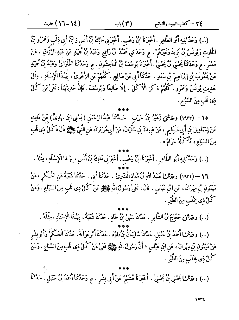 (١٩٣٢) - وحَدَّثَنِيهِ أَبُو الطَّاهِرِ، أَخْبَرَنَا ابْنُ وَهْبٍ، أَخْبَرَنِي مَالِكُ بْنُ أَنَسٍ، وَابْنُ أَبِي ذِئْبٍ، وَعَمْرُو بْنُ الْحَارِثِ، وَيُونُسُ بْنُ يَزِيدَ، وَغَيْرُهُمْ، ح وحَدَّثَنِي مُحَمَّدُ بْنُ رَافِعٍ، وَعَبْدُ بْنُ حُمَيْدٍ، عَنْ عَبْدِ الرَّزَّاقِ، عَنْ مَعْمَرٍ، ح وحَدَّثَنَا يَحْيَى بْنُ يَحْيَى، أَخْبَرَنَا يُوسُفُ بْنُ الْمَاجِشُونِ، ح وحَدَّثَنَا الْحُلْوَانِيُّ، وَعَبْدُ بْنُ حُمَيْدٍ، عَنْ يَعْقُوبَ بْنِ إِبْرَاهِيمَ بْنِ سَعْدٍ، حَدَّثَنَا أَبِي، عَنْ صَالِحٍ، كُلُّهُمْ عَنِ الزُّهْرِيِّ، بِهَذَا الْإِسْنَادِ مِثْلَ حَدِيثِ يُونُسَ، وَعَمْرٍو، كُلُّهُمْ ذَكَرَ الْأَكْلَ إِلَّا صَالِحًا، وَيُوسُفَ، فَإِنَّ حَدِيثَهُمَا نَهَى عَنْ كُلِّ ذِي نَابٍ مِنَ السَّبُعِ