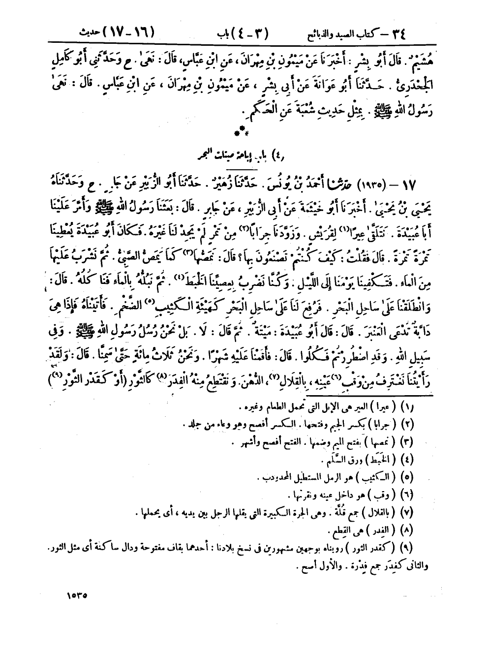 ١٧ - (١٩٣٥) حَدَّثَنَا أَحْمَدُ بْنُ يُونُسَ، حَدَّثَنَا زُهَيْرٌ، حَدَّثَنَا أَبُو الزُّبَيْرِ، عَنْ جَابِرٍ، ح وَحَدَّثَنَاهُ يَحْيَى بْنُ يَحْيَى، أَخْبَرَنَا أَبُو خَيْثَمَةَ، عَنْ أَبِي الزُّبَيْرِ، عَنْ جَابِرٍ، قَالَ: بَعَثَنَا رَسُولُ اللهِ صَلَّى اللهُ عَلَيْهِ وَسَلَّمَ وَأَمَّرَ عَلَيْنَا أَبَا عُبَيْدَةَ، نَتَلَقَّى عِيرًا لِقُرَيْشٍ، وَزَوَّدَنَا جِرَابًا مِنْ تَمْرٍ لَمْ يَجِدْ لَنَا غَيْرَهُ، فَكَانَ أَبُو عُبَيْدَةَ يُعْطِينَا تَمْرَةً تَمْرَةً، قَالَ: فَقُلْتُ: كَيْفَ كُنْتُمْ تَصْنَعُونَ بِهَا؟ قَالَ: نَمَصُّهَا كَمَا يَمَصُّ الصَّبِيُّ، ثُمَّ نَشْرَبُ عَلَيْهَا مِنَ الْمَاءِ، فَتَكْفِينَا يَوْمَنَا إِلَى اللَّيْلِ، وَكُنَّا نَضْرِبُ بِعِصِيِّنَا الْخَبَطَ، ثُمَّ نَبُلُّهُ بِالْمَاءِ فَنَأْكُلُهُ، قَالَ: وَانْطَلَقْنَا عَلَى سَاحِلِ الْبَحْرِ، فَرُفِعَ لَنَا عَلَى سَاحِلِ الْبَحْرِ كَهَيْئَةِ الْكَثِيبِ الضَّخْمِ، فَأَتَيْنَاهُ فَإِذَا هِيَ دَابَّةٌ تُدْعَى الْعَنْبَرَ، قَالَ: قَالَ أَبُو عُبَيْدَةَ: مَيْتَةٌ، ثُمَّ قَالَ: لَا، بَلْ نَحْنُ رُسُلُ رَسُولِ اللهِ صَلَّى اللهُ عَلَيْهِ وَسَلَّمَ، وَفِي سَبِيلِ اللهِ، وَقَدِ اضْطُرِرْتُمْ فَكُلُوا، قَالَ: فَأَقَمْنَا عَلَيْهِ شَهْرًا وَنَحْنُ ثَلَاثُ مِائَةٍ حَتَّى سَمِنَّا، قَالَ: وَلَقَدْ رَأَيْتُنَا نَغْتَرِفُ مِنْ وَقْبِ عَيْنِهِ بِالْقِلَالِ الدُّهْنَ، وَنَقْتَطِعُ مِنْهُ الْفِدَرَ كَالثَّوْرِ، أَوْ كَقَدْرِ الثَّوْرِ، فَلَقَدْ أَخَذَ مِنَّا أَبُو عُبَيْدَةَ ثَلَاثَةَ عَشَرَ رَجُلًا، فَأَقْعَدَهُمْ فِي وَقْبِ عَيْنِهِ، وَأَخَذَ ضِلَعًا مِنْ أَضْلَاعِهِ فَأَقَامَهَا ثُمَّ رَحَلَ أَعْظَمَ بَعِيرٍ مَعَنَا، فَمَرَّ مِنْ تَحْتِهَا وَتَزَوَّدْنَا مِنْ لَحْمِهِ وَشَائِقَ، فَلَمَّا قَدِمْنَا الْمَدِينَةَ أَتَيْنَا رَسُولَ اللهِ صَلَّى اللهُ عَلَيْهِ وَسَلَّمَ، فَذَكَرْنَا ذَلِكَ لَهُ، فَقَالَ: «هُوَ رِزْقٌ أَخْرَجَهُ اللهُ لَكُمْ، فَهَلْ مَعَكُمْ مِنْ لَحْمِهِ شَيْءٌ فَتُطْعِمُونَا؟»، قَالَ: فَأَرْسَلْنَا إِلَى رَسُولِ اللهِ صَلَّى اللهُ عَلَيْهِ وَسَلَّمَ مِنْهُ فَأَكَلَهُ