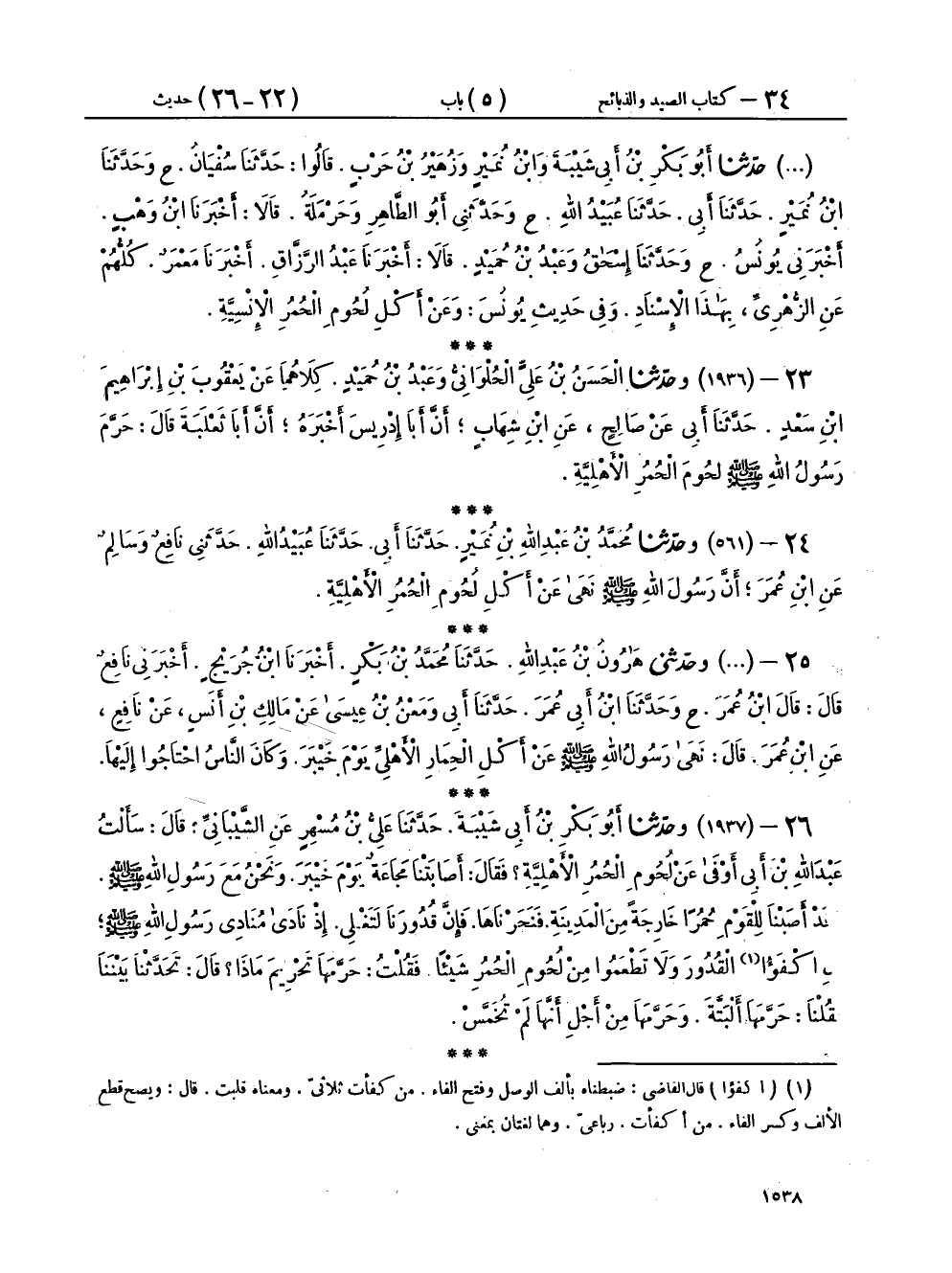 (١٤٠٧) - حَدَّثَنَا أَبُو بَكْرِ بْنُ أَبِي شَيْبَةَ، وَابْنُ نُمَيْرٍ، وَزُهَيْرُ بْنُ حَرْبٍ، قَالُوا: حَدَّثَنَا سُفْيَانُ، ح وحَدَّثَنَا ابْنُ نُمَيْرٍ، حَدَّثَنَا أَبِي، حَدَّثَنَا عُبَيْدُ اللهِ، ح وحَدَّثَنِي أَبُو الطَّاهِرِ، وَحَرْمَلَةُ، قَالَا: أَخْبَرَنَا ابْنُ وَهْبٍ، أَخْبَرَنِي يُونُسُ، ح وحَدَّثَنَا إِسْحَاقُ، وَعَبْدُ بْنُ حُمَيْدٍ، قَالَا: أَخْبَرَنَا عَبْدُ الرَّزَّاقِ، أَخْبَرَنَا مَعْمَرٌ، كُلُّهُمْ عَنِ الزُّهْرِيِّ، بِهَذَا الْإِسْنَادِ، وَفِي حَدِيثِ يُونُسَ، وَعَنْ أَكْلِ لُحُومِ الْحُمُرِ الْإِنْسِيَّةِ