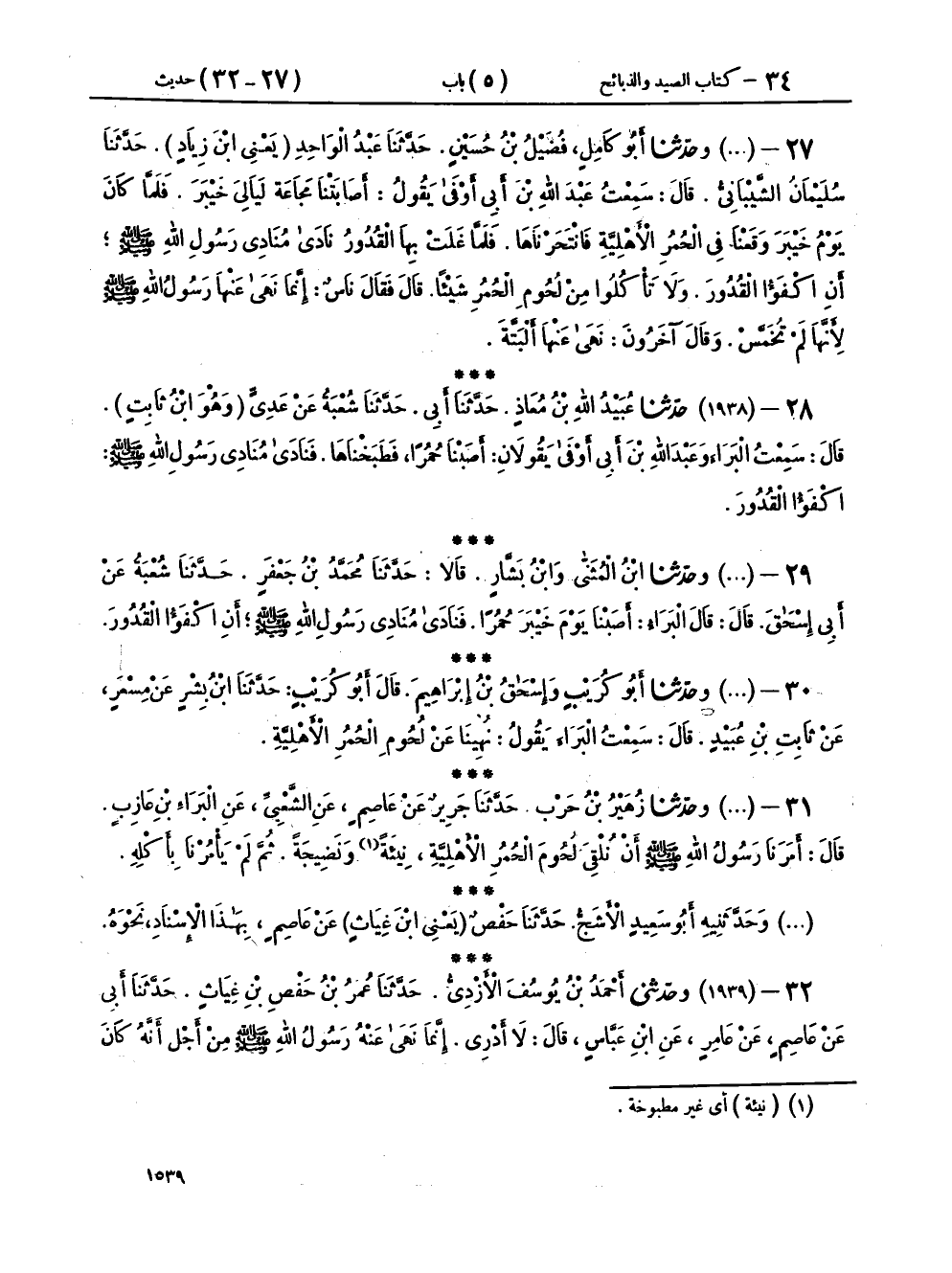 ٣٠ - (١٩٣٨) وحَدَّثَنَا أَبُو كُرَيْبٍ، وَإِسْحَاقُ بْنُ إِبْرَاهِيمَ، قَالَ أَبُو كُرَيْبٍ: حَدَّثَنَا ابْنُ بِشْرٍ، عَنْ مِسْعَرٍ، عَنْ ثَابِتِ بْنِ عُبَيْدٍ، قَالَ: سَمِعْتُ الْبَرَاءَ، يَقُولُ: «نُهِينَا عَنْ لُحُومِ الْحُمُرِ الْأَهْلِيَّةِ»