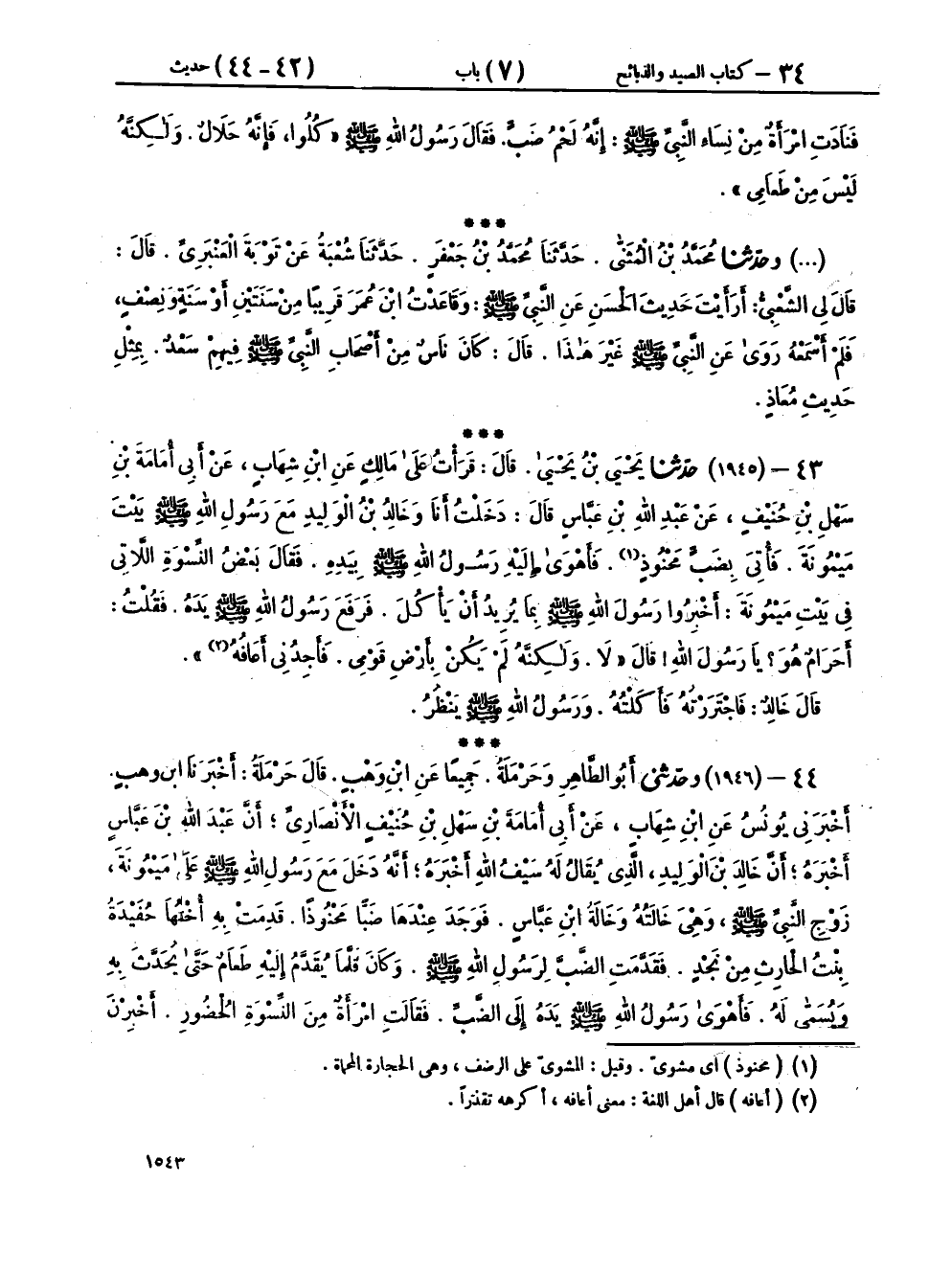 ٤٣ - (١٩٤٥) حَدَّثَنَا يَحْيَى بْنُ يَحْيَى، قَالَ: قَرَأْتُ عَلَى مَالِكٍ، عَنِ ابْنِ شِهَابٍ، عَنْ أَبِي أُمَامَةَ بْنِ سَهْلِ بْنِ حُنَيْفٍ، عَنْ عَبْدِ اللهِ بْنِ عَبَّاسٍ، قَالَ: دَخَلْتُ أَنَا وَخَالِدُ بْنُ الْوَلِيدِ، مَعَ رَسُولِ اللهِ صَلَّى اللهُ عَلَيْهِ وَسَلَّمَ بَيْتَ مَيْمُونَةَ، فَأُتِيَ بِضَبٍّ مَحْنُوذٍ، فَأَهْوَى إِلَيْهِ رَسُولُ اللهِ صَلَّى اللهُ عَلَيْهِ وَسَلَّمَ بِيَدِهِ، فَقَالَ بَعْضُ النِّسْوَةِ اللَّاتِي فِي بَيْتِ مَيْمُونَةَ: أَخْبِرُوا رَسُولَ اللهِ صَلَّى اللهُ عَلَيْهِ وَسَلَّمَ بِمَا يُرِيدُ أَنْ يَأْكُلَ، فَرَفَعَ رَسُولُ اللهِ صَلَّى اللهُ عَلَيْهِ وَسَلَّمَ يَدَهُ، فَقُلْتُ: أَحَرَامٌ هُوَ يَا رَسُولَ اللهِ؟ قَالَ: «لَا، وَلَكِنَّهُ لَمْ يَكُنْ بِأَرْضِ قَوْمِي فَأَجِدُنِي أَعَافُهُ»، قَالَ خَالِدٌ: فَاجْتَرَرْتُهُ فَأَكَلْتُهُ وَرَسُولُ اللهِ صَلَّى اللهُ عَلَيْهِ وَسَلَّمَ يَنْظُرُ