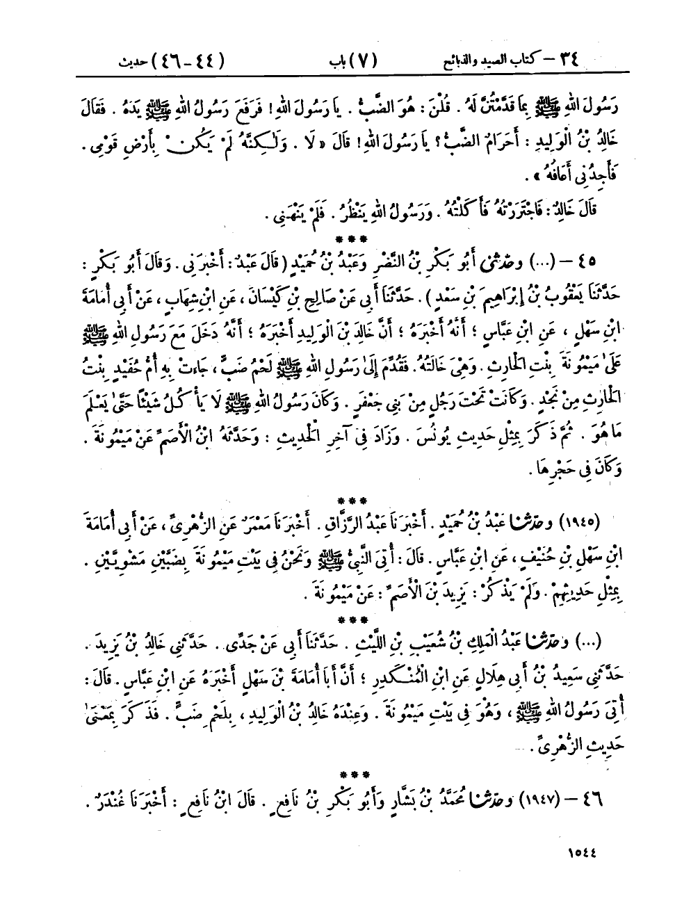 ٤٥ - (١٩٤٦) وحَدَّثَنِي أَبُو بَكْرِ بْنُ النَّضْرِ، وَعَبْدُ بْنُ حُمَيْدٍ، قَالَ عَبْدٌ: أَخْبَرَنِي، وقَالَ أَبُو بَكْرٍ: حَدَّثَنَا يَعْقُوبُ بْنُ إِبْرَاهِيمَ بْنِ سَعْدٍ، حَدَّثَنَا أَبِي، عَنْ صَالِحِ بْنِ كَيْسَانَ، عَنِ ابْنِ شِهَابٍ، عَنْ أَبِي أُمَامَةَ بْنِ سَهْلٍ، عَنِ ابْنِ عَبَّاسٍ، أَنَّهُ أَخْبَرَهُ أَنَّ خَالِدَ بْنَ الْوَلِيدِ، أَخْبَرَهُ، أَنَّهُ دَخَلَ مَعَ رَسُولِ اللهِ صَلَّى اللهُ عَلَيْهِ وَسَلَّمَ عَلَى مَيْمُونَةَ بِنْتِ الْحَارِثِ وَهِيَ خَالَتُهُ، فَقُدِّمَ إِلَى رَسُولِ اللهِ صَلَّى اللهُ عَلَيْهِ وَسَلَّمَ لَحْمُ ضَبٍّ جَاءَتْ بِهِ أُمُّ حُفَيْدٍ بِنْتُ الْحَارِثِ مِنْ نَجْدٍ، وَكَانَتْ تَحْتَ رَجُلٍ مِنْ بَنِي جَعْفَرٍ، وَكَانَ رَسُولُ اللهِ صَلَّى اللهُ عَلَيْهِ وَسَلَّمَ لَا يَأْكُلُ شَيْئًا حَتَّى يَعْلَمَ مَا هُوَ، ثُمَّ ذَكَرَ بِمِثْلِ حَدِيثِ يُونُسَ، وَزَادَ فِي آخِرِ الْحَدِيثِ: وَحَدَّثَهُ ابْنُ الْأَصَمِّ، عَنْ مَيْمُونَةَ وَكَانَ فِي حَجْرِهَا،