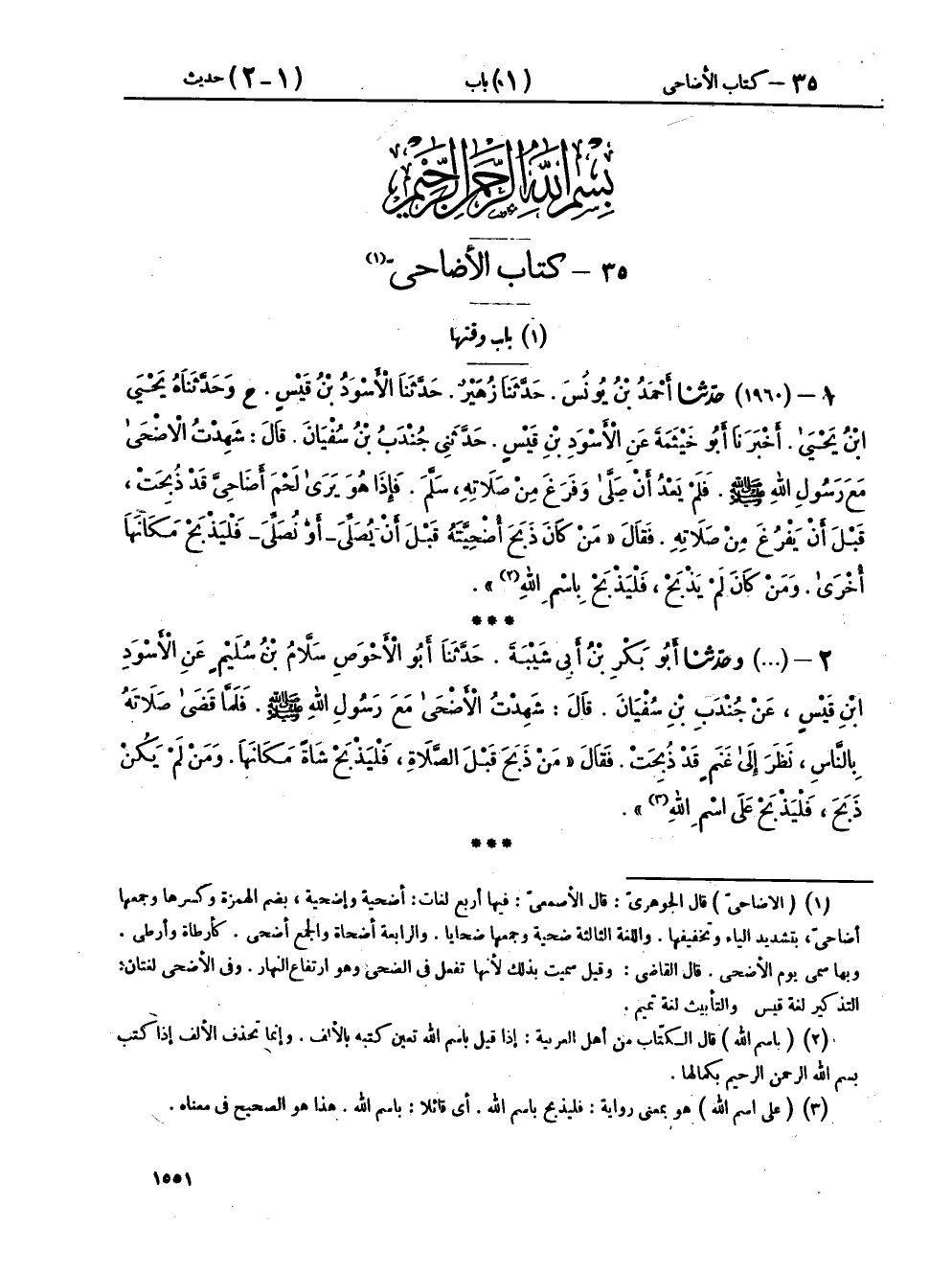 ١ - (١٩٦٠) حَدَّثَنَا أَحْمَدُ بْنُ يُونُسَ، حَدَّثَنَا زُهَيْرٌ، حَدَّثَنَا الْأَسْوَدُ بْنُ قَيْسٍ، ح وَحَدَّثَنَاهُ يَحْيَى بْنُ يَحْيَى، أَخْبَرَنَا أَبُو خَيْثَمَةَ، عَنِ الْأَسْوَدِ بْنِ قَيْسٍ، حَدَّثَنِي جُنْدَبُ بْنُ سُفْيَانَ، قَالَ: شَهِدْتُ الْأَضْحَى مَعَ رَسُولِ اللهِ صَلَّى اللهُ عَلَيْهِ وَسَلَّمَ، فَلَمْ يَعْدُ أَنْ صَلَّى وَفَرَغَ مِنْ صَلَاتِهِ سَلَّمَ، فَإِذَا هُوَ يَرَى لَحْمَ أَضَاحِيَّ قَدْ ذُبِحَتْ قَبْلَ أَنْ يَفْرُغَ مِنْ صَلَاتِهِ، فَقَالَ: «مَنْ كَانَ ذَبَحَ أُضْحِيَّتَهُ قَبْلَ أَنْ يُصَلِّيَ - أَوْ نُصَلِّيَ -، فَلْيَذْبَحْ مَكَانَهَا أُخْرَى، وَمَنْ كَانَ لَمْ يَذْبَحْ، فَلْيَذْبَحْ بِاسْمِ اللهِ»