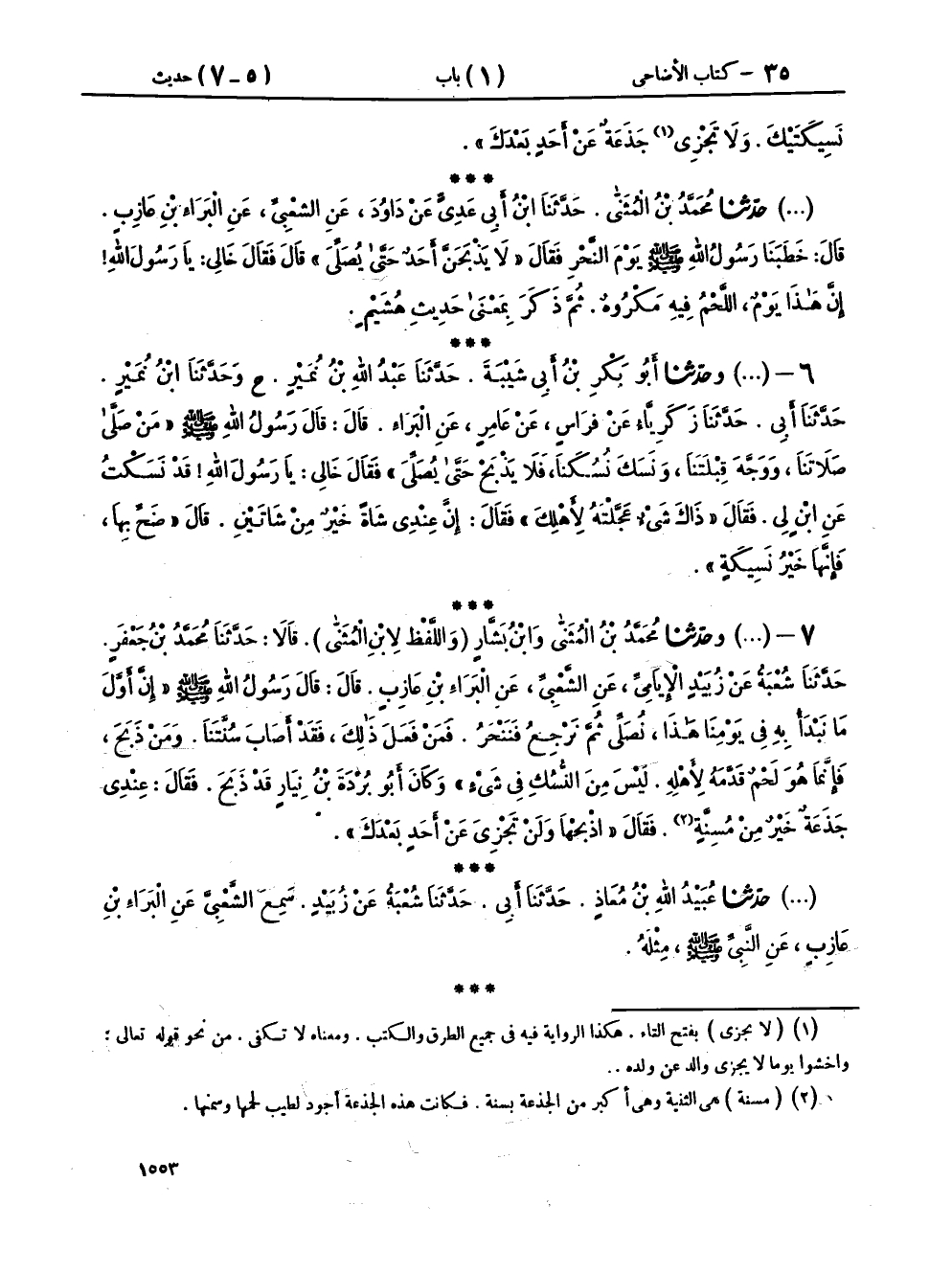 ٧ - (١٩٦١) وحَدَّثَنَا مُحَمَّدُ بْنُ الْمُثَنَّى، وَابْنُ بَشَّارٍ، وَاللَّفْظُ لِابْنِ الْمُثَنَّى، قَالَا: حَدَّثَنَا مُحَمَّدُ بْنُ جَعْفَرٍ، حَدَّثَنَا شُعْبَةُ، عَنْ زُبَيْدٍ الْإِيَامِيِّ، عَنِ الشَّعْبِيِّ، عَنِ الْبَرَاءِ بْنِ عَازِبٍ، قَالَ: قَالَ رَسُولُ اللهِ صَلَّى اللهُ عَلَيْهِ وَسَلَّمَ: «إِنَّ أَوَّلَ مَا نَبْدَأُ بِهِ فِي يَوْمِنَا هَذَا نُصَلِّي، ثُمَّ نَرْجِعُ فَنَنْحَرُ، فَمَنْ فَعَلَ ذَلِكَ، فَقَدْ أَصَابَ سُنَّتَنَا، وَمَنْ ذَبَحَ، فَإِنَّمَا هُوَ لَحْمٌ قَدَّمَهُ لِأَهْلِهِ لَيْسَ مِنَ النُّسُكِ فِي شَيْءٍ»، وَكَانَ أَبُو بُرْدَةَ بْنُ نِيَارٍ قَدْ ذَبَحَ، فَقَالَ: عِنْدِي جَذَعَةٌ خَيْرٌ مِنْ مُسِنَّةٍ، فَقَالَ: «اذْبَحْهَا وَلَنْ تَجْزِيَ عَنْ أَحَدٍ بَعْدَكَ»،