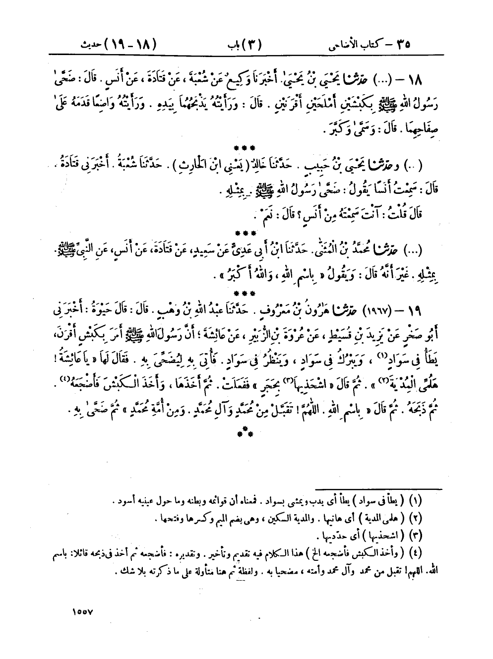 ١٨ - (١٩٦٦) حَدَّثَنَا يَحْيَى بْنُ يَحْيَى، أَخْبَرَنَا وَكِيعٌ، عَنْ شُعْبَةَ، عَنْ قَتَادَةَ، عَنْ أَنَسٍ، قَالَ: «ضَحَّى رَسُولُ اللهِ صَلَّى اللهُ عَلَيْهِ وَسَلَّمَ بِكَبْشَيْنِ أَمْلَحَيْنِ أَقْرَنَيْنِ»، قَالَ: «وَرَأَيْتُهُ يَذْبَحُهُمَا بِيَدِهِ، وَرَأَيْتُهُ وَاضِعًا قَدَمَهُ عَلَى صِفَاحِهِمَا»، قَالَ: «وَسَمَّى وَكَبَّرَ»،