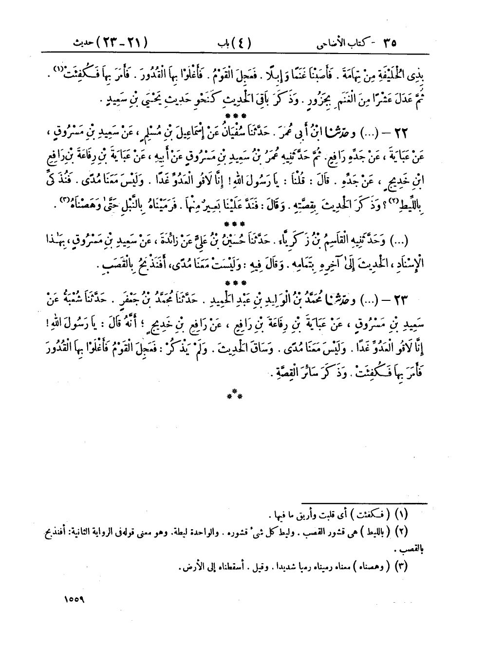٢٣ - (١٩٦٨) وحَدَّثَنَا مُحَمَّدُ بْنُ الْوَلِيدِ بْنِ عَبْدِ الْحَمِيدِ، حَدَّثَنَا مُحَمَّدُ بْنُ جَعْفَرٍ، حَدَّثَنَا شُعْبَةُ، عَنْ سَعِيدِ بْنِ مَسْرُوقٍ، عَنْ عَبَايَةَ بْنِ رِفَاعَةَ بْنِ رَافِعٍ، عَنْ رَافِعِ بْنِ خَدِيجٍ، أَنَّهُ قَالَ: يَا رَسُولَ اللهِ، إِنَّا لَاقُو الْعَدُوِّ غَدًا وَلَيْسَ مَعَنَا مُدًى، وَسَاقَ الْحَدِيثَ، وَلَمْ يَذْكُرْ فَعَجِلَ الْقَوْمُ، فَأَغْلَوْا بِهَا الْقُدُورَ، فَأَمَرَ بِهَا فَكُفِئَتْ وَذَكَرَ سَائِرَ الْقِصَّةِ