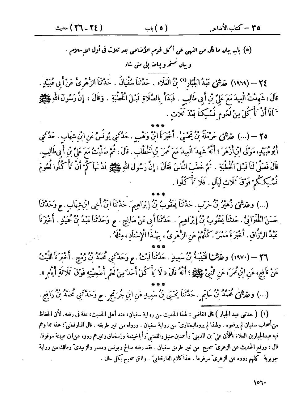 ٢٤ - (١٩٦٩) حَدَّثَنِي عَبْدُ الْجَبَّارِ بْنُ الْعَلَاءِ، حَدَّثَنَا سُفْيَانُ، حَدَّثَنَا الزُّهْرِيُّ، عَنْ أَبِي عُبَيْدٍ، قَالَ: شَهِدْتُ الْعِيدَ مَعَ عَلِيِّ بْنِ أَبِي طَالِبٍ، فَبَدَأَ بِالصَّلَاةِ قَبْلَ الْخُطْبَةِ، وَقَالَ: «إِنَّ رَسُولَ اللهِ صَلَّى اللهُ عَلَيْهِ وَسَلَّمَ نَهَانَا أَنْ نَأْكُلَ مِنْ لُحُومِ نُسُكِنَا بَعْدَ ثَلَاثٍ»