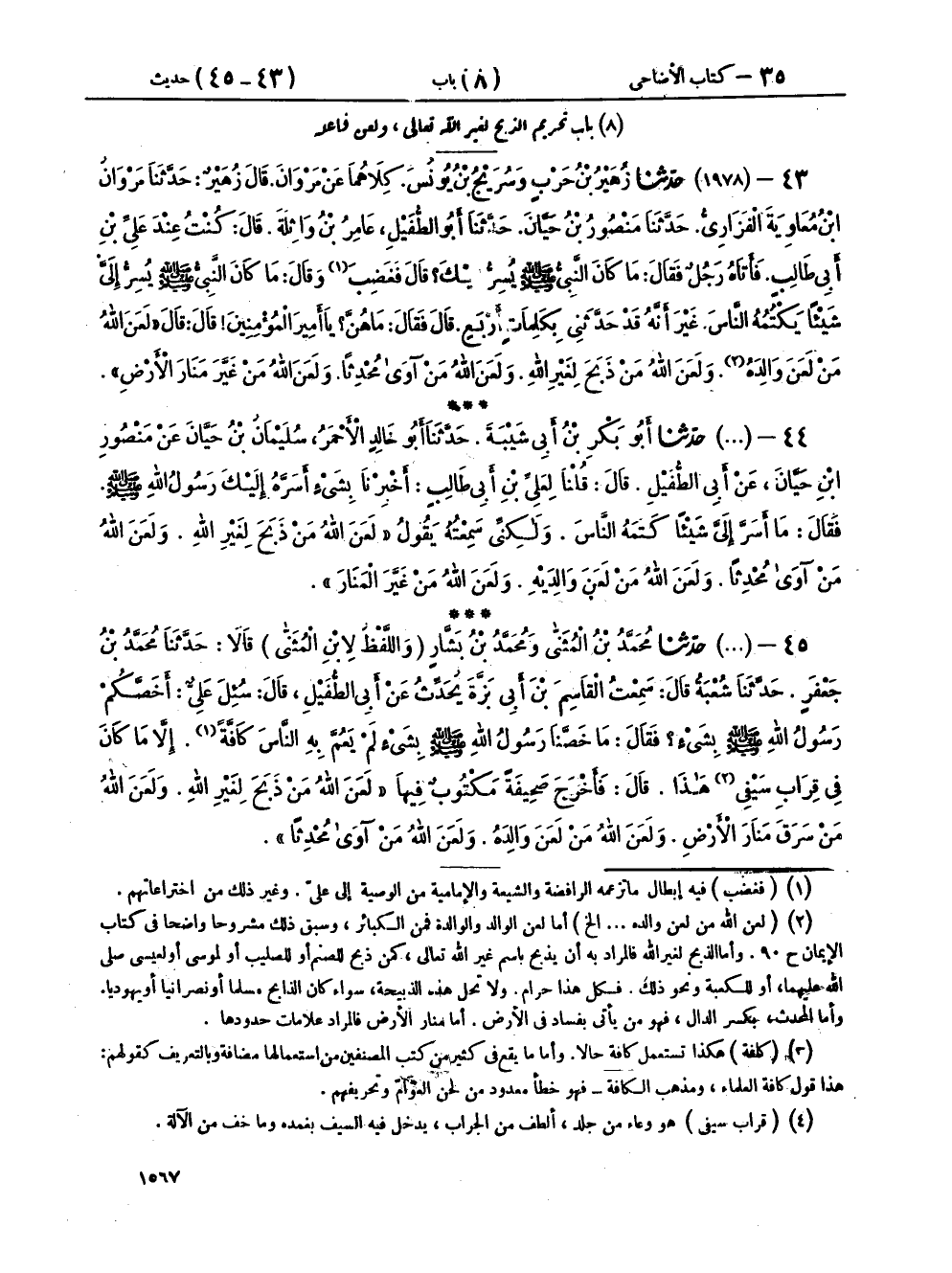 ٤٣ - (١٩٧٨) حَدَّثَنَا زُهَيْرُ بْنُ حَرْبٍ، وَسُرَيْجُ بْنُ يُونُسَ، كِلَاهُمَا عَنْ مَرْوَانَ، قَالَ زُهَيْرٌ: حَدَّثَنَا مَرْوَانُ بْنُ مُعَاوِيَةَ الْفَزَارِيُّ، حَدَّثَنَا مَنْصُورُ بْنُ حَيَّانَ، حَدَّثَنَا أَبُو الطُّفَيْلِ عَامِرُ بْنُ وَاثِلَةَ، قَالَ: كُنْتُ عِنْدَ عَلِيِّ بْنِ أَبِي طَالِبٍ، فَأَتَاهُ رَجُلٌ، فَقَالَ: مَا كَانَ النَّبِيُّ صَلَّى اللهُ عَلَيْهِ وَسَلَّمَ يُسِرُّ إِلَيْكَ، قَالَ: فَغَضِبَ، وَقَالَ: مَا كَانَ النَّبِيُّ صَلَّى اللهُ عَلَيْهِ وَسَلَّمَ يُسِرُّ إِلَيَّ شَيْئًا يَكْتُمُهُ النَّاسَ، غَيْرَ أَنَّهُ قَدْ حَدَّثَنِي بِكَلِمَاتٍ أَرْبَعٍ، قَالَ: فَقَالَ: مَا هُنَّ يَا أَمِيرَ الْمُؤْمِنِينَ؟ قَالَ: قَالَ: «لَعَنَ اللهُ مَنْ لَعَنَ وَالِدَهُ، وَلَعَنَ اللهُ مَنْ ذَبَحَ لِغَيْرِ اللهِ، وَلَعَنَ اللهُ مَنْ آوَى مُحْدِثًا، وَلَعَنَ اللهُ مَنْ غَيَّرَ مَنَارَ الْأَرْضِ»