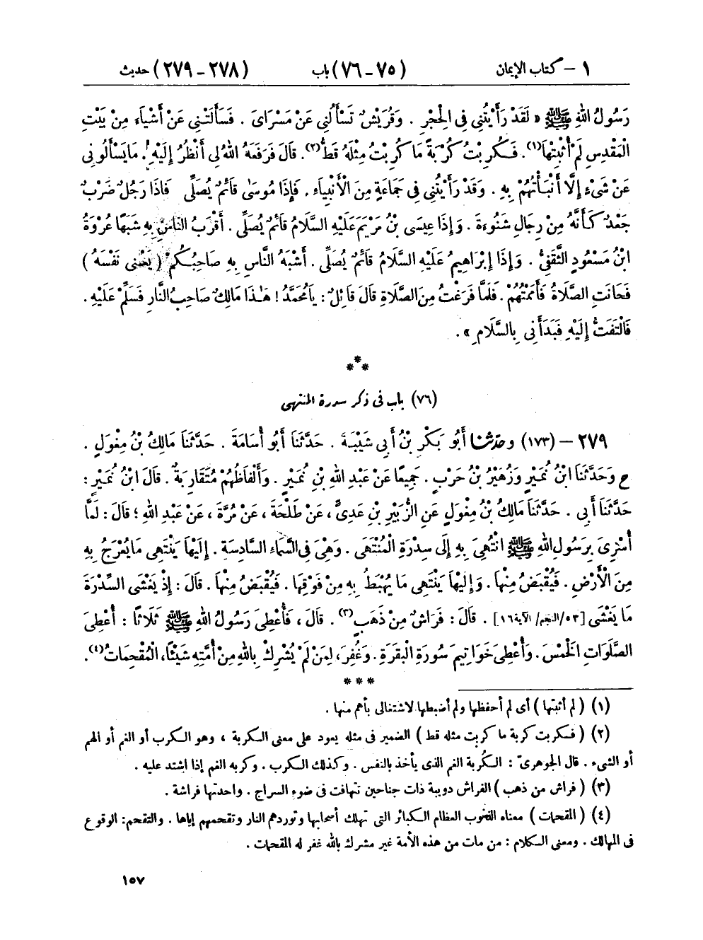٢٧٩ - (١٧٣) وَحَدَّثَنَا أَبُو بَكْرِ بْنُ أَبِي شَيْبَةَ، حَدَّثَنَا أَبُو أُسَامَةَ، حَدَّثَنَا مَالِكُ بْنُ مِغْوَلٍ، ح، وَحَدَّثَنَا ابْنُ نُمَيْرٍ، وَزُهَيْرُ بْنُ حَرْبٍ، جَمِيعًا عَنْ عَبْدِ اللهِ بْنِ نُمَيْرٍ، وَأَلْفَاظُهُمْ مُتَقَارِبَةٌ، قَالَ ابْنُ نُمَيْرٍ: حَدَّثَنَا أَبِي، حَدَّثَنَا مَالِكُ بْنُ مِغْوَلٍ، عَنِ الزُّبَيْرِ بْنِ عَدِيٍّ، عَنْ طَلْحَةَ، عَنْ مُرَّةَ، عَنْ عَبْدِ اللهِ، قَالَ: «لَمَّا أُسْرِيَ بِرَسُولِ اللهِ صَلَّى اللهُ عَلَيْهِ وَسَلَّمَ، انْتُهِيَ بِهِ إِلَى سِدْرَةِ الْمُنْتَهَى، وَهِيَ فِي السَّمَاءِ السَّادِسَةِ، إِلَيْهَا يَنْتَهِي مَا يُعْرَجُ بِهِ مِنَ الْأَرْضِ فَيُقْبَضُ مِنْهَا، وَإِلَيْهَا يَنْتَهِي مَا يُهْبَطُ بِهِ مِنْ فَوْقِهَا فَيُقْبَضُ مِنْهَا»، قَالَ: " {إِذْ يَغْشَى} [النجم: ١٦] السِّدْرَةَ مَا يَغْشَى "، قَالَ: «فَرَاشٌ مِنْ ذَهَبٍ»، قَالَ: " فَأُعْطِيَ رَسُولُ اللهِ صَلَّى اللهُ عَلَيْهِ وَسَلَّمَ ثَلَاثًا: أُعْطِيَ الصَّلَوَاتِ الْخَمْسَ، وَأُعْطِيَ خَوَاتِيمَ سُورَةِ الْبَقَرَةِ، وَغُفِرَ لِمَنْ لَمْ يُشْرِكْ بِاللهِ مِنْ أُمَّتِهِ شَيْئًا، الْمُقْحِمَاتُ "