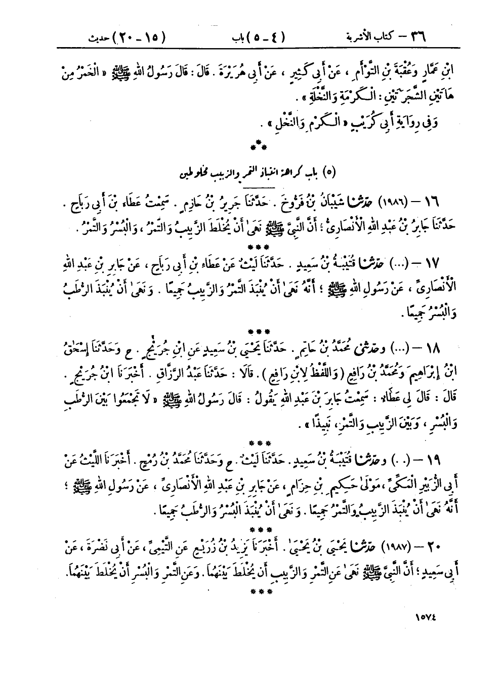 ١٩ - (١٩٨٦) وحَدَّثَنَا قُتَيْبَةُ بْنُ سَعِيدٍ، حَدَّثَنَا لَيْثٌ، ح وحَدَّثَنَا مُحَمَّدُ بْنُ رُمْحٍ، أَخْبَرَنَا اللَّيْثُ، عَنْ أَبِي الزُّبَيْرِ الْمَكِّيِّ، مَوْلَى حَكِيمِ بْنِ حِزَامٍ، عَنْ جَابِرِ بْنِ عَبْدِ اللهِ الْأَنْصَارِيِّ، عَنْ رَسُولِ اللهِ صَلَّى اللهُ عَلَيْهِ وَسَلَّمَ، «أَنَّهُ نَهَى أَنْ يُنْبَذَ الزَّبِيبُ وَالتَّمْرُ جَمِيعًا، وَنَهَى أَنْ يُنْبَذَ الْبُسْرُ وَالرُّطَبُ جَمِيعًا»