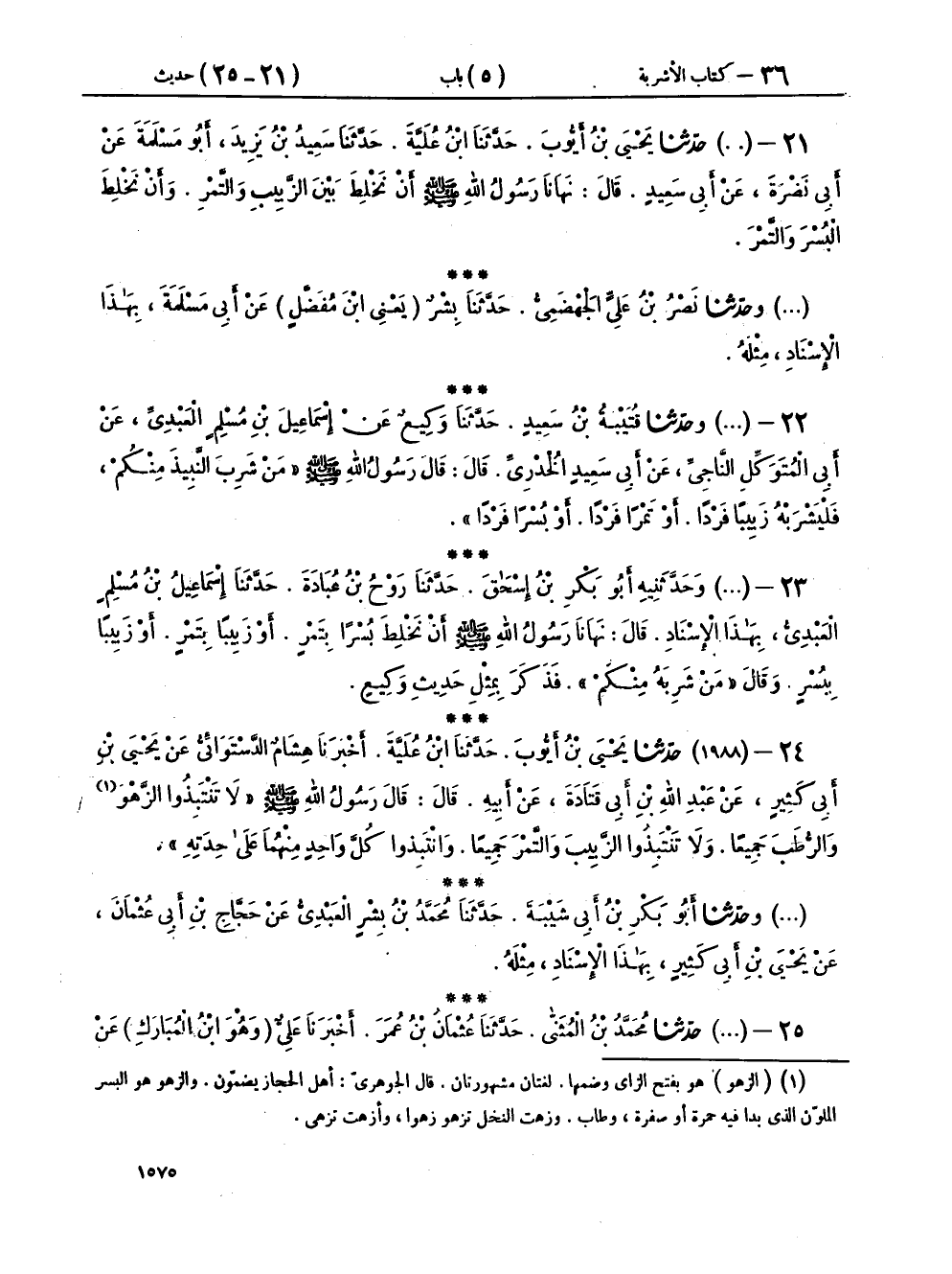 ٢٤ - (١٩٨٨) حَدَّثَنَا يَحْيَى بْنُ أَيُّوبَ، حَدَّثَنَا ابْنُ عُلَيَّةَ، أَخْبَرَنَا هِشَامٌ الدَّسْتَوَائِيُّ، عَنْ يَحْيَى بْنِ أَبِي كَثِيرٍ، عَنْ عَبْدِ اللهِ بْنِ أَبِي قَتَادَةَ، عَنْ أَبِيهِ، قَالَ: قَالَ رَسُولُ اللهِ صَلَّى اللهُ عَلَيْهِ وَسَلَّمَ: «لَا تَنْتَبِذُوا الزَّهْوَ وَالرُّطَبَ جَمِيعًا، وَلَا تَنْتَبِذُوا الزَّبِيبَ وَالتَّمْرَ جَمِيعًا، وَانْتَبِذُوا كُلَّ وَاحِدٍ مِنْهُمَا عَلَى حِدَتِهِ»،