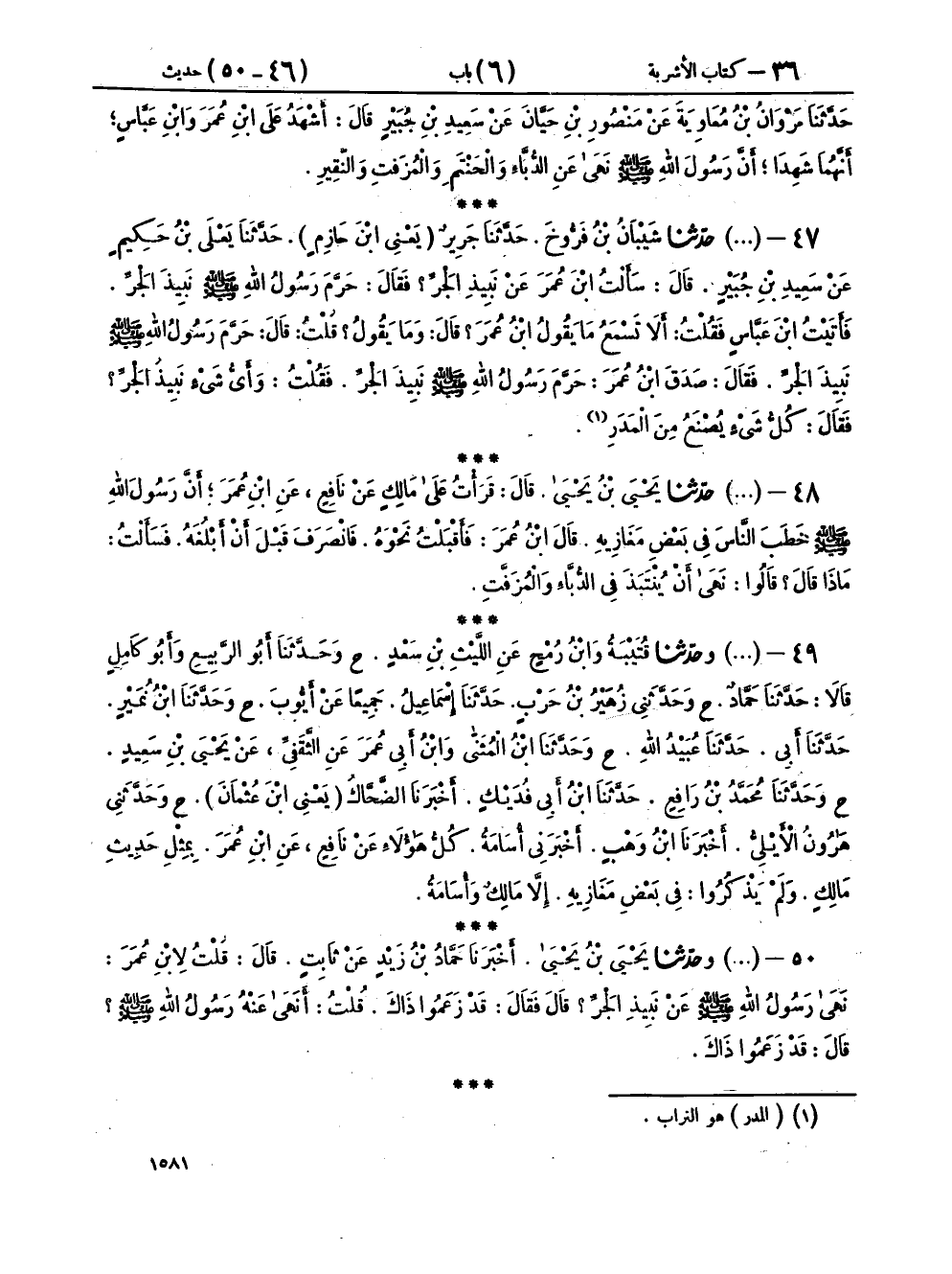 ٤٨ - (١٩٩٧) حَدَّثَنَا يَحْيَى بْنُ يَحْيَى، قَالَ: قَرَأْتُ عَلَى مَالِكٍ، عَنْ نَافِعٍ، عَنِ ابْنِ عُمَرَ، أَنَّ رَسُولَ اللهِ صَلَّى اللهُ عَلَيْهِ وَسَلَّمَ خَطَبَ النَّاسَ فِي بَعْضِ مَغَازِيهِ، قَالَ ابْنُ عُمَرَ: فَأَقْبَلْتُ نَحْوَهُ، فَانْصَرَفَ قَبْلَ أَنْ أَبْلُغَهُ، فَسَأَلْتُ مَاذَا، قَالَ: قَالُوا: «نَهَى أَنْ يُنْتَبَذَ فِي الدُّبَّاءِ وَالْمُزَفَّتِ»،