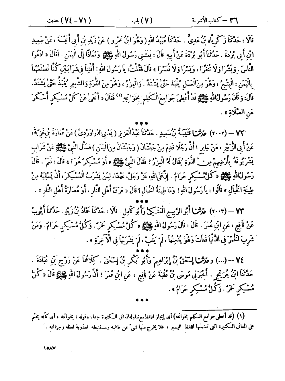٧٣ - (٢٠٠٣) حَدَّثَنَا أَبُو الرَّبِيعِ الْعَتَكِيُّ، وَأَبُو كَامِلٍ، قَالَا: حَدَّثَنَا حَمَّادُ بْنُ زَيْدٍ، حَدَّثَنَا أَيُّوبُ، عَنْ نَافِعٍ، عَنِ ابْنِ عُمَرَ، قَالَ: قَالَ رَسُولُ اللهِ صَلَّى اللهُ عَلَيْهِ وَسَلَّمَ: «كُلُّ مُسْكِرٍ خَمْرٌ، وَكُلُّ مُسْكِرٍ حَرَامٌ، وَمَنْ شَرِبَ الْخَمْرَ فِي الدُّنْيَا فَمَاتَ وَهُوَ يُدْمِنُهَا لَمْ يَتُبْ، لَمْ يَشْرَبْهَا فِي الْآخِرَةِ»