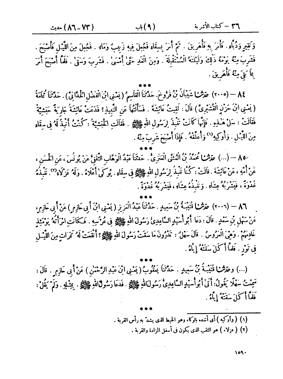 ٨٤ - (٢٠٠٥) حَدَّثَنَا شَيْبَانُ بْنُ فَرُّوخَ، حَدَّثَنَا الْقَاسِمُ يَعْنِي ابْنَ الْفَضْلِ الْحُدَّانِيَّ، حَدَّثَنَا ثُمَامَةُ يَعْنِي ابْنَ حَزْنٍ الْقُشَيْرِيَّ، قَالَ: لَقِيتُ عَائِشَةَ، فَسَأَلْتُهَا عَنِ النَّبِيذِ، فَدَعَتْ عَائِشَةُ جَارِيَةً حَبَشِيَّةً، فَقَالَتْ: سَلْ هَذِهِ، فَإِنَّهَا كَانَتْ تَنْبِذُ لِرَسُولِ اللهِ صَلَّى اللهُ عَلَيْهِ وَسَلَّمَ، فَقَالَتِ الْحَبَشِيَّةُ: «كُنْتُ أَنْبِذُ لَهُ فِي سِقَاءٍ مِنَ اللَّيْلِ وَأُوكِيهِ وَأُعَلِّقُهُ، فَإِذَا أَصْبَحَ شَرِبَ مِنْهُ»