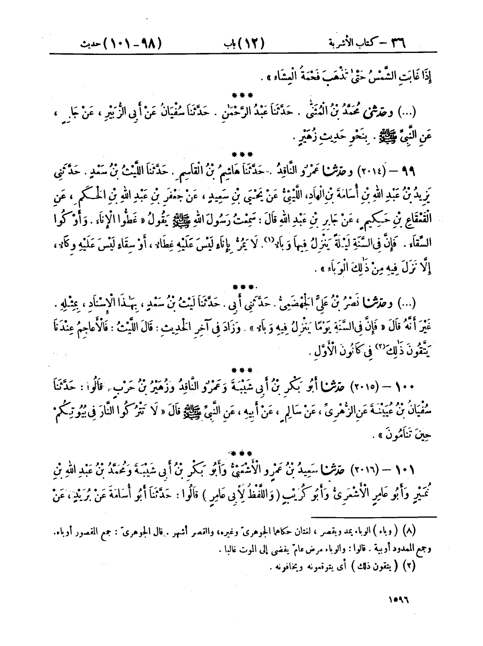 ٩٩ - (٢٠١٤) وحَدَّثَنَا عَمْرٌو النَّاقِدُ، حَدَّثَنَا هَاشِمُ بْنُ الْقَاسِمِ، حَدَّثَنَا اللَّيْثُ بْنُ سَعْدٍ، حَدَّثَنِي يَزِيدُ بْنُ عَبْدِ اللهِ بْنِ أُسَامَةَ بْنِ الْهَادِ اللَّيْثِيُّ، عَنْ يَحْيَى بْنِ سَعِيدٍ، عَنْ جَعْفَرِ بْنِ عَبْدِ اللهِ بْنِ الْحَكَمِ، عَنِ الْقَعْقَاعِ بْنِ حَكِيمٍ، عَنْ جَابِرِ بْنِ عَبْدِ اللهِ، قَالَ: سَمِعْتُ رَسُولَ اللهِ صَلَّى اللهُ عَلَيْهِ وَسَلَّمَ، يَقُولُ: «غَطُّوا الْإِنَاءَ، وَأَوْكُوا السِّقَاءَ، فَإِنَّ فِي السَّنَةِ لَيْلَةً يَنْزِلُ فِيهَا وَبَاءٌ، لَا يَمُرُّ بِإِنَاءٍ لَيْسَ عَلَيْهِ غِطَاءٌ، أَوْ سِقَاءٍ لَيْسَ عَلَيْهِ وِكَاءٌ، إِلَّا نَزَلَ فِيهِ مِنْ ذَلِكَ الْوَبَاءِ»،