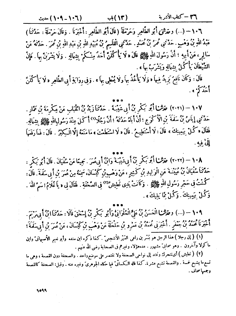 ١٠٦ - (٢٠٢٠) وحَدَّثَنِي أَبُو الطَّاهِرِ، وَحَرْمَلَةُ، قَالَ أَبُو الطَّاهِرِ: أَخْبَرَنَا، وقَالَ حَرْمَلَةُ: حَدَّثَنَا عَبْدُ اللهِ بْنُ وَهْبٍ، حَدَّثَنِي عُمَرُ بْنُ مُحَمَّدٍ، حَدَّثَنِي الْقَاسِمُ بْنُ عُبَيْدِ اللهِ بْنِ عَبْدِ اللهِ بْنِ عُمَرَ، حَدَّثَهُ عَنْ سَالِمٍ، عَنْ أَبِيهِ، أَنَّ رَسُولَ اللهِ صَلَّى اللهُ عَلَيْهِ وَسَلَّمَ، قَالَ: «لَا يَأْكُلَنَّ أَحَدٌ مِنْكُمْ بِشِمَالِهِ، وَلَا يَشْرَبَنَّ بِهَا، فَإِنَّ الشَّيْطَانَ يَأْكُلُ بِشِمَالِهِ، وَيَشْرَبُ بِهَا»، قَالَ: وَكَانَ نَافِعٌ يَزِيدُ فِيهَا: «وَلَا يَأْخُذُ بِهَا، وَلَا يُعْطِي بِهَا»، وَفِي رِوَايَةِ أَبِي الطَّاهِرِ: «لَا يَأْكُلَنَّ أَحَدُكُمْ»