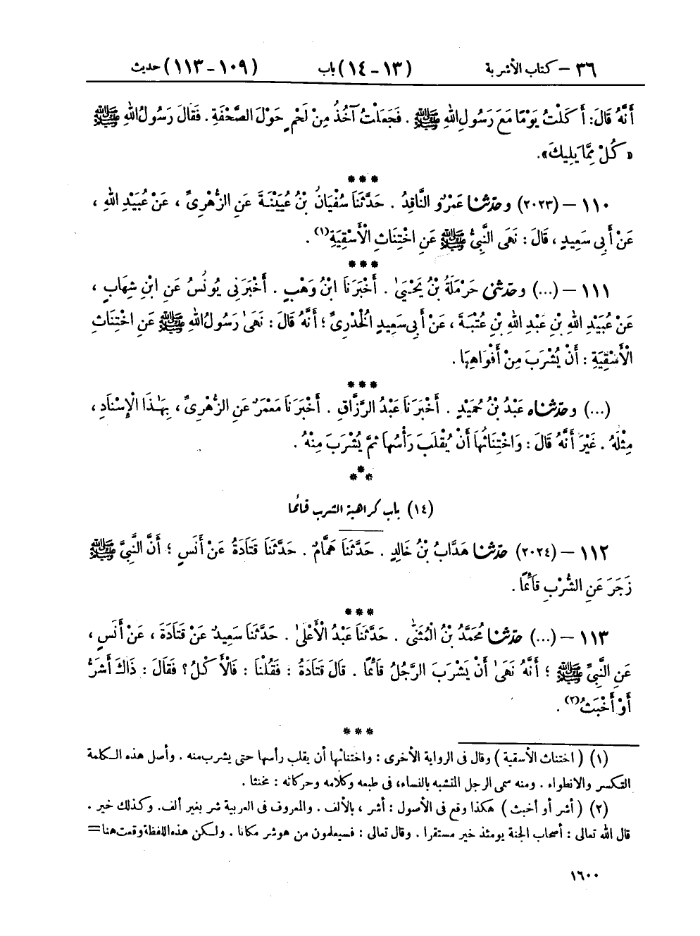 ١١٠ - (٢٠٢٣) وحَدَّثَنَا عَمْرٌو النَّاقِدُ، حَدَّثَنَا سُفْيَانُ بْنُ عُيَيْنَةَ، عَنِ الزُّهْرِيِّ، عَنْ عُبَيْدِ اللهِ، عَنْ أَبِي سَعِيدٍ، قَالَ: «نَهَى النَّبِيُّ صَلَّى اللهُ عَلَيْهِ وَسَلَّمَ عَنِ اخْتِنَاثِ الْأَسْقِيَةِ»
