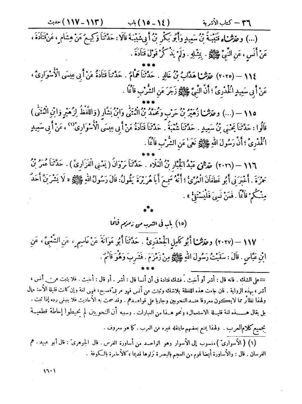١١٤ - (٢٠٢٥) حَدَّثَنَا هَدَّابُ بْنُ خَالِدٍ، حَدَّثَنَا هَمَّامٌ، حَدَّثَنَا قَتَادَةُ، عَنْ أَبِي عِيسَى الْأُسْوَارِيِّ، عَنْ أَبِي سَعِيدٍ الْخُدْرِيِّ، «أَنَّ النَّبِيَّ صَلَّى اللهُ عَلَيْهِ وَسَلَّمَ زَجَرَ عَنِ الشُّرْبِ قَائِمًا»