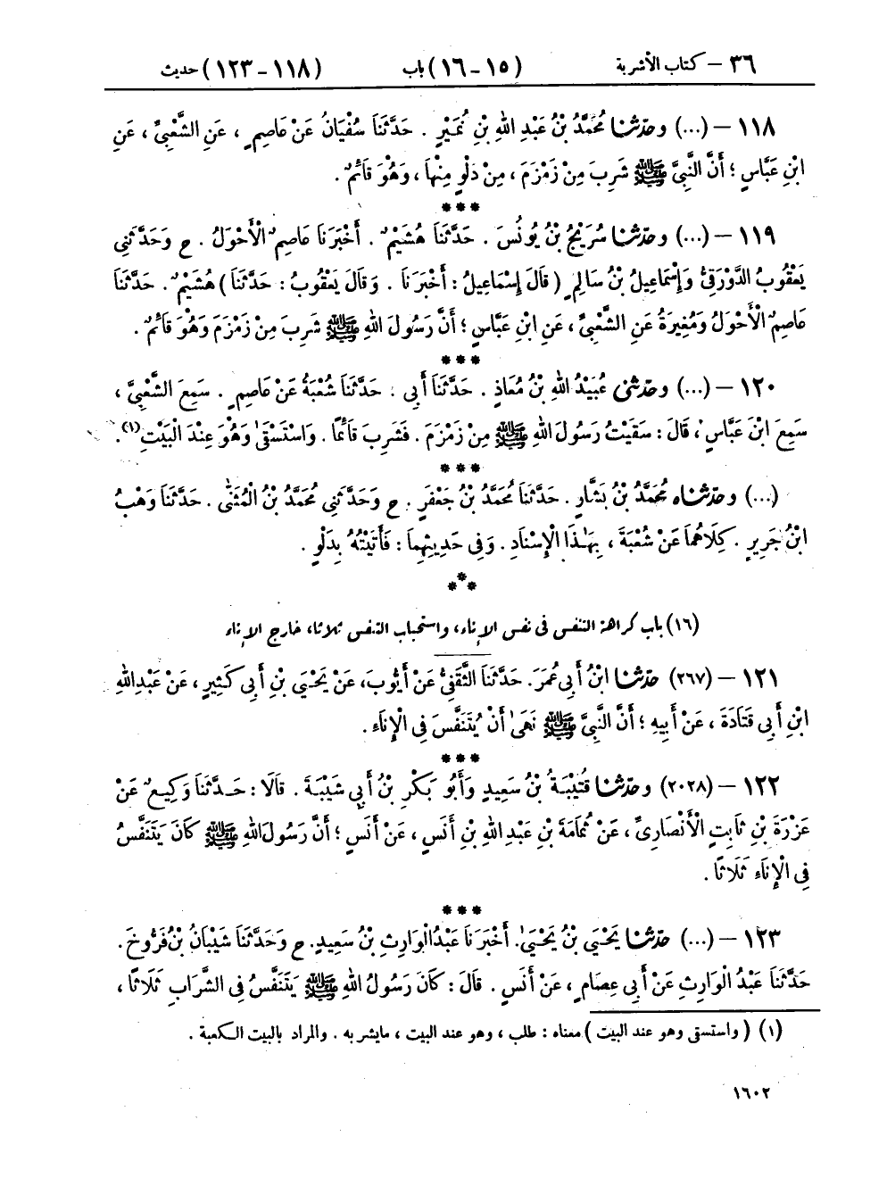 ١١٨ - (٢٠٢٧) وحَدَّثَنَا مُحَمَّدُ بْنُ عَبْدِ اللهِ بْنِ نُمَيْرٍ، حَدَّثَنَا سُفْيَانُ، عَنْ عَاصِمٍ، عَنِ الشَّعْبِيِّ، عَنِ ابْنِ عَبَّاسٍ، «أَنَّ النَّبِيَّ صَلَّى اللهُ عَلَيْهِ وَسَلَّمَ شَرِبَ مِنْ زَمْزَمَ مِنْ دَلْوٍ مِنْهَا وَهُوَ قَائِمٌ»