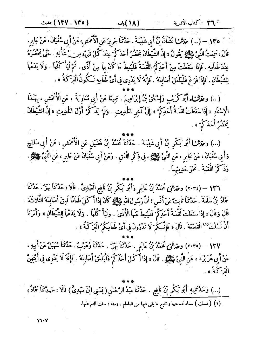 ١٣٥ - (٢٠٣٣) حَدَّثَنَا عُثْمَانُ بْنُ أَبِي شَيْبَةَ، حَدَّثَنَا جَرِيرٌ، عَنِ الْأَعْمَشِ، عَنْ أَبِي سُفْيَانَ، عَنْ جَابِرٍ، قَالَ: سَمِعْتُ النَّبِيَّ صَلَّى اللهُ عَلَيْهِ وَسَلَّمَ يَقُولُ: «إِنَّ الشَّيْطَانَ يَحْضُرُ أَحَدَكُمْ عِنْدَ كُلِّ شَيْءٍ مِنْ شَأْنِهِ، حَتَّى يَحْضُرَهُ عِنْدَ طَعَامِهِ، فَإِذَا سَقَطَتْ مِنْ أَحَدِكُمُ اللُّقْمَةُ، فَلْيُمِطْ مَا كَانَ بِهَا مِنْ أَذًى، ثُمَّ لِيَأْكُلْهَا، وَلَا يَدَعْهَا لِلشَّيْطَانِ، فَإِذَا فَرَغَ فَلْيَلْعَقْ أَصَابِعَهُ، فَإِنَّهُ لَا يَدْرِي فِي أَيِّ طَعَامِهِ تَكُونُ الْبَرَكَةُ»،