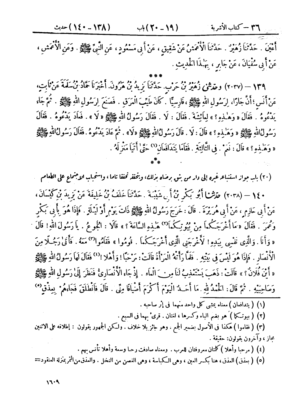 ١٣٩ - (٢٠٣٧) وحَدَّثَنِي زُهَيْرُ بْنُ حَرْبٍ، حَدَّثَنَا يَزِيدُ بْنُ هَارُونَ، أَخْبَرَنَا حَمَّادُ بْنُ سَلَمَةَ، عَنْ ثَابِتٍ، عَنْ أَنَسٍ، أَنَّ جَارًا لِرَسُولِ اللهِ صَلَّى اللهُ عَلَيْهِ وَسَلَّمَ فَارِسِيًّا كَانَ طَيِّبَ الْمَرَقِ، فَصَنَعَ لِرَسُولِ اللهِ صَلَّى اللهُ عَلَيْهِ وَسَلَّمَ، ثُمَّ جَاءَ يَدْعُوهُ، فَقَالَ: «وَهَذِهِ؟» لِعَائِشَةَ، فَقَالَ: لَا، فَقَالَ رَسُولُ اللهِ صَلَّى اللهُ عَلَيْهِ وَسَلَّمَ: «لَا»، فَعَادَ يَدْعُوهُ، فَقَالَ رَسُولُ اللهِ صَلَّى اللهُ عَلَيْهِ وَسَلَّمَ: «وَهَذِهِ؟»، قَالَ: لَا، قَالَ رَسُولُ اللهِ صَلَّى اللهُ عَلَيْهِ وَسَلَّمَ: «لَا»، ثُمَّ عَادَ يَدْعُوهُ، فَقَالَ رَسُولُ اللهِ صَلَّى اللهُ عَلَيْهِ وَسَلَّمَ: «وَهَذِهِ؟»، قَالَ: نَعَمْ فِي الثَّالِثَةِ، فَقَامَا يَتَدَافَعَانِ حَتَّى أَتَيَا مَنْزِلَهُ