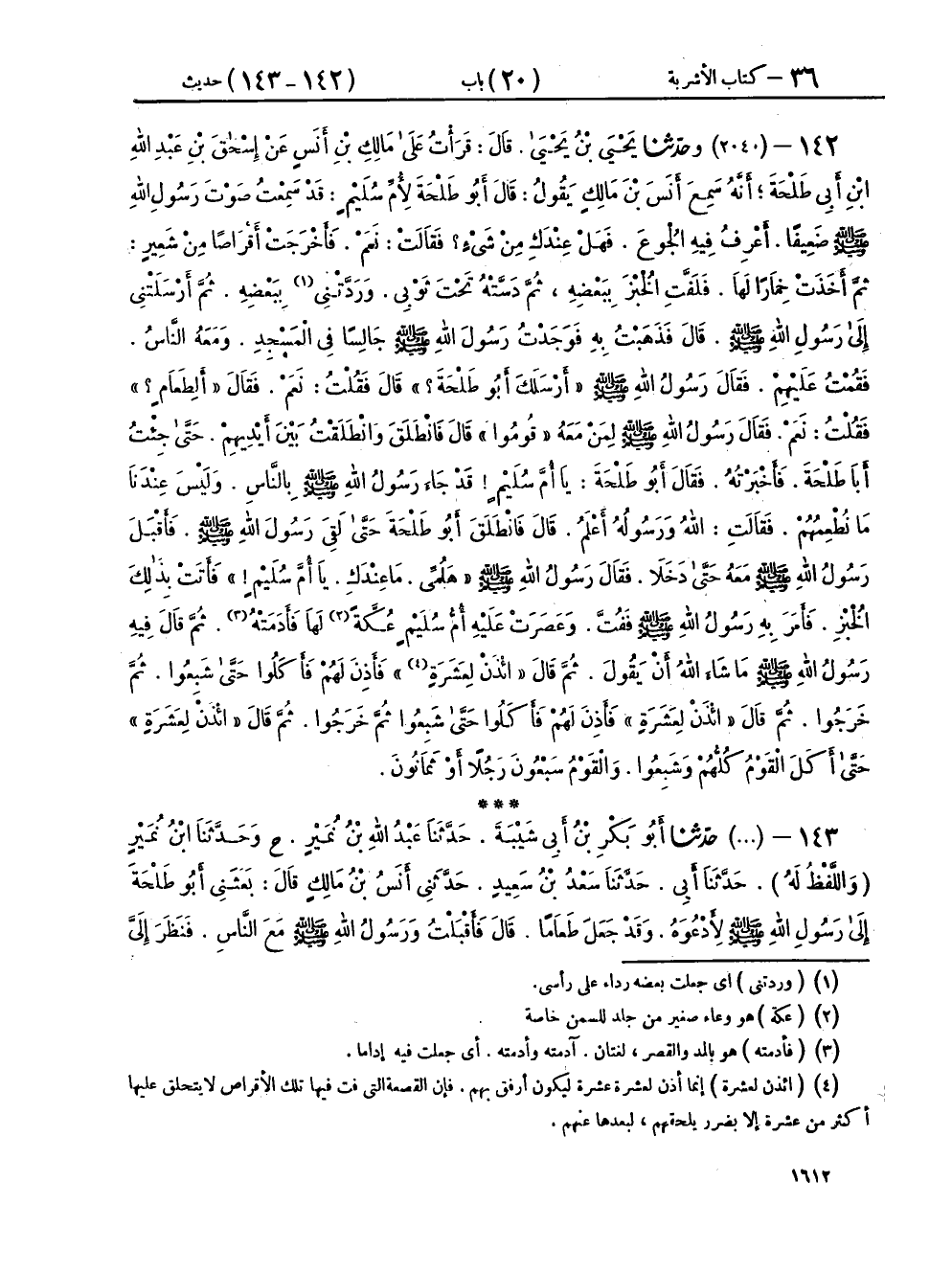 ١٤٣ - (٢٠٤٠) حَدَّثَنَا أَبُو بَكْرِ بْنُ أَبِي شَيْبَةَ، حَدَّثَنَا عَبْدُ اللهِ بْنُ نُمَيْرٍ، ح وحَدَّثَنَا ابْنُ نُمَيْرٍ، وَاللَّفْظُ لَهُ، حَدَّثَنَا أَبِي، حَدَّثَنَا سَعْدُ بْنُ سَعِيدٍ، حَدَّثَنِي أَنَسُ بْنُ مَالِكٍ، قَالَ: بَعَثَنِي أَبُو طَلْحَةَ إِلَى رَسُولِ اللهِ صَلَّى اللهُ عَلَيْهِ وَسَلَّمَ لِأَدْعُوَهُ وَقَدْ جَعَلَ طَعَامًا، قَالَ: فَأَقْبَلْتُ وَرَسُولُ اللهِ صَلَّى اللهُ عَلَيْهِ وَسَلَّمَ مَعَ النَّاسِ، فَنَظَرَ إِلَيَّ فَاسْتَحْيَيْتُ، فَقُلْتُ: أَجِبْ أَبَا طَلْحَةَ، فَقَالَ لِلنَّاسِ: «قُومُوا»، فَقَالَ أَبُو طَلْحَةَ: يَا رَسُولَ اللهِ، إِنَّمَا صَنَعْتُ لَكَ شَيْئًا، قَالَ: فَمَسَّهَا رَسُولُ اللهِ صَلَّى اللهُ عَلَيْهِ وَسَلَّمَ وَدَعَا فِيهَا بِالْبَرَكَةِ، ثُمَّ قَالَ: «أَدْخِلْ نَفَرًا مِنْ أَصْحَابِي عَشَرَةً»، وَقَالَ: «كُلُوا»، وَأَخْرَجَ لَهُمْ شَيْئًا مِنْ بَيْنِ أَصَابِعِهِ، فَأَكَلُوا حَتَّى شَبِعُوا فَخَرَجُوا، فَقَالَ: «أَدْخِلْ عَشَرَةً»، فَأَكَلُوا حَتَّى شَبِعُوا، فَمَا زَالَ يُدْخِلُ عَشَرَةً وَيُخْرِجُ عَشَرَةً حَتَّى لَمْ يَبْقَ مِنْهُمْ أَحَدٌ إِلَّا دَخَلَ، فَأَكَلَ حَتَّى شَبِعَ، ثُمَّ هَيَّأَهَا فَإِذَا هِيَ مِثْلُهَا حِينَ أَكَلُوا مِنْهَا،