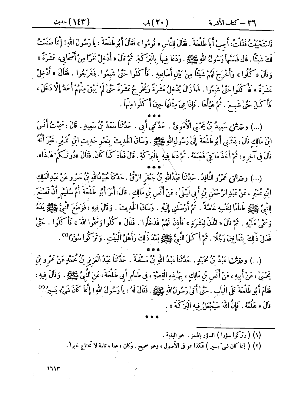 ٢ - وحَدَّثَنِي عَمْرٌو النَّاقِدُ، حَدَّثَنَا عَبْدُ اللهِ بْنُ جَعْفَرٍ الرَّقِّيُّ، حَدَّثَنَا عُبَيْدُ اللهِ بْنُ عَمْرٍو، عَنْ عَبْدِ الْمَلِكِ بْنِ عُمَيْرٍ، عَنْ عَبْدِ الرَّحْمَنِ بْنِ أَبِي لَيْلَى، عَنْ أَنَسِ بْنِ مَالِكٍ، قَالَ: أَمَرَ أَبُو طَلْحَةَ أُمَّ سُلَيْمٍ أَنْ تَصْنَعَ لِلنَّبِيِّ صَلَّى اللهُ عَلَيْهِ وَسَلَّمَ طَعَامًا لِنَفْسِهِ خَاصَّةً، ثُمَّ أَرْسَلَنِي إِلَيْهِ وَسَاقَ الْحَدِيثَ، وَقَالَ فِيهِ: فَوَضَعَ النَّبِيُّ صَلَّى اللهُ عَلَيْهِ وَسَلَّمَ يَدَهُ وَسَمَّى عَلَيْهِ، ثُمَّ قَالَ: «ائْذَنْ لِعَشَرَةٍ»، فَأَذِنَ لَهُمْ فَدَخَلُوا، فَقَالَ: «كُلُوا وَسَمُّوا اللهَ»، فَأَكَلُوا حَتَّى فَعَلَ ذَلِكَ بِثَمَانِينَ رَجُلًا، ثُمَّ أَكَلَ النَّبِيُّ صَلَّى اللهُ عَلَيْهِ وَسَلَّمَ بَعْدَ ذَلِكَ وَأَهْلُ الْبَيْتِ، وَتَرَكُوا سُؤْرًا،