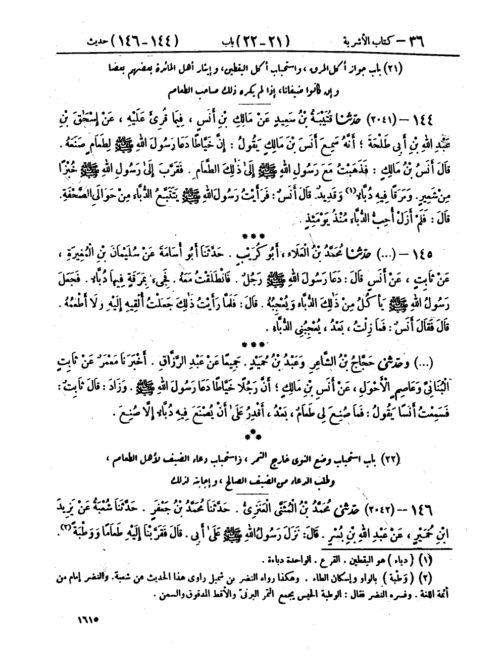 ١٤٤ - (٢٠٤١) حَدَّثَنَا قُتَيْبَةُ بْنُ سَعِيدٍ، عَنْ مَالِكِ بْنِ أَنَسٍ، فِيمَا قُرِئَ عَلَيْهِ، عَنْ إِسْحَاقَ بْنِ عَبْدِ اللهِ بْنِ أَبِي طَلْحَةَ، أَنَّهُ سَمِعَ أَنَسَ بْنَ مَالِكٍ، يَقُولُ: «إِنَّ خَيَّاطًا دَعَا رَسُولَ اللهِ صَلَّى اللهُ عَلَيْهِ وَسَلَّمَ لِطَعَامٍ صَنَعَهُ»، قَالَ أَنَسُ بْنُ مَالِكٍ: «فَذَهَبْتُ مَعَ رَسُولِ اللهِ صَلَّى اللهُ عَلَيْهِ وَسَلَّمَ إِلَى ذَلِكَ الطَّعَامِ، فَقَرَّبَ إِلَى رَسُولِ اللهِ صَلَّى اللهُ عَلَيْهِ وَسَلَّمَ خُبْزًا مِنْ شَعِيرٍ وَمَرَقًا فِيهِ دُبَّاءٌ وَقَدِيدٌ»، قَالَ أَنَسٌ: «فَرَأَيْتُ رَسُولَ اللهِ صَلَّى اللهُ عَلَيْهِ وَسَلَّمَ يَتَتَبَّعُ الدُّبَّاءَ مِنْ حَوَالَيِ الصَّحْفَةِ»، قَالَ: «فَلَمْ أَزَلْ أُحِبُّ الدُّبَّاءَ مُنْذُ يَوْمَئِذٍ»