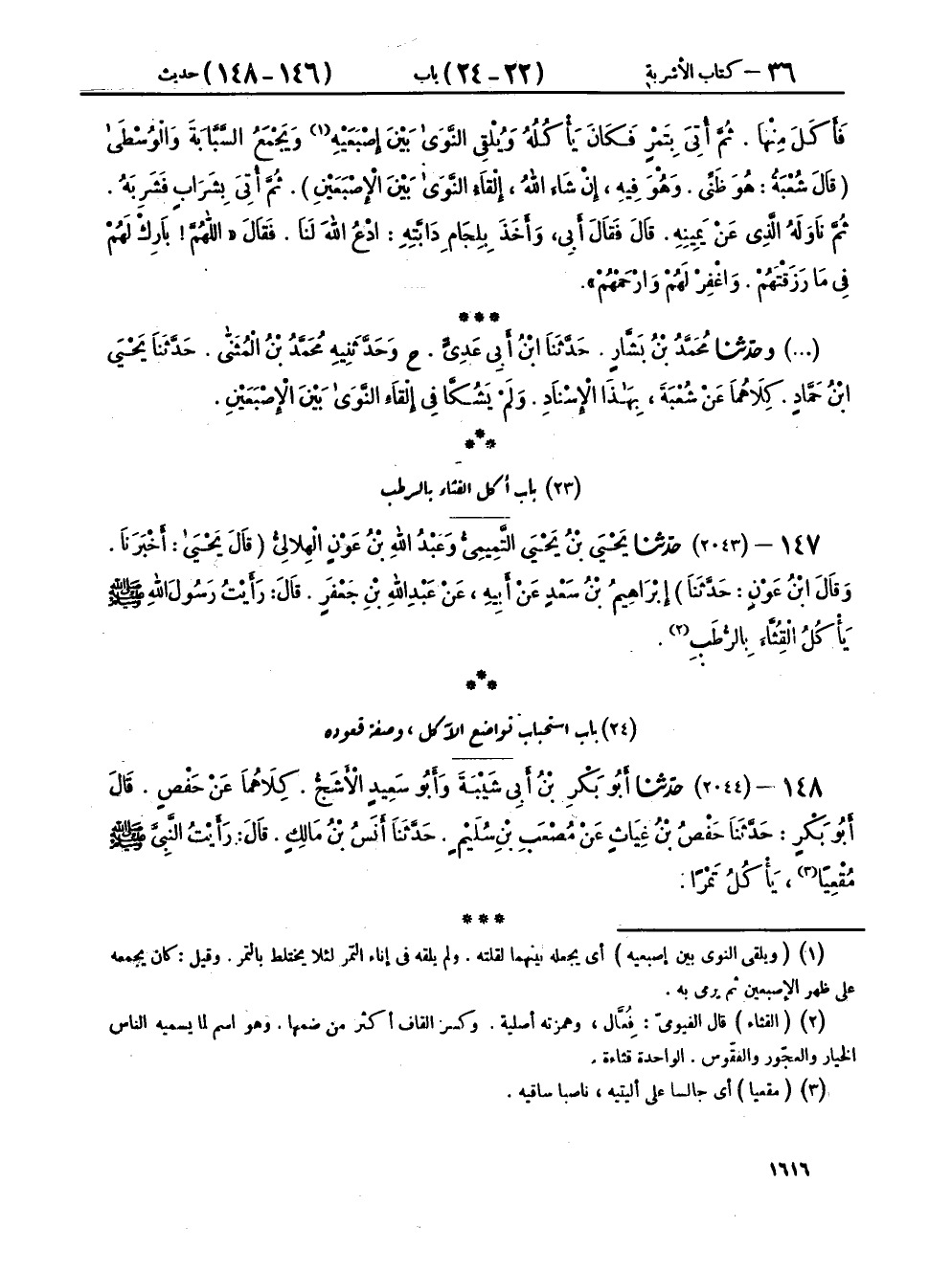 ١٤٨ - (٢٠٤٤) حَدَّثَنَا أَبُو بَكْرِ بْنُ أَبِي شَيْبَةَ، وَأَبُو سَعِيدٍ الْأَشَجُّ، كِلَاهُمَا عَنْ حَفْصٍ، قَالَ أَبُو بَكْرٍ: حَدَّثَنَا حَفْصُ بْنُ غِيَاثٍ، عَنْ مُصْعَبِ بْنِ سُلَيْمٍ، حَدَّثَنَا أَنَسُ بْنُ مَالِكٍ، قَالَ: «رَأَيْتُ النَّبِيَّ صَلَّى اللهُ عَلَيْهِ وَسَلَّمَ مُقْعِيًا يَأْكُلُ تَمْرًا»
