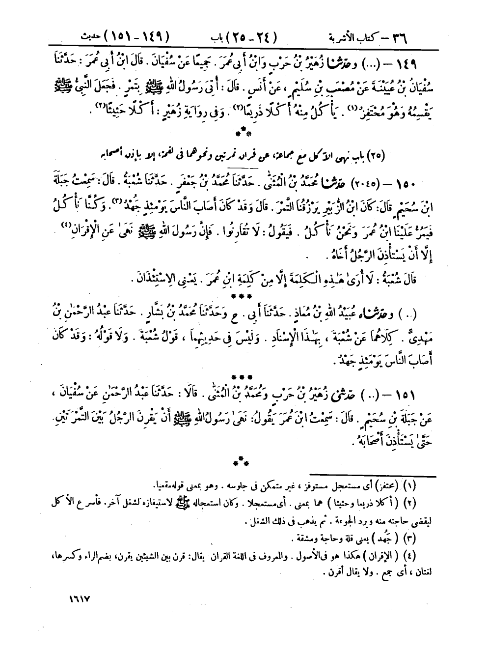 ١٥٠ - (٢٠٤٥) حَدَّثَنَا مُحَمَّدُ بْنُ الْمُثَنَّى، حَدَّثَنَا مُحَمَّدُ بْنُ جَعْفَرٍ، حَدَّثَنَا شُعْبَةُ، قَالَ: سَمِعْتُ جَبَلَةَ بْنَ سُحَيْمٍ، قَالَ: كَانَ ابْنُ الزُّبَيْرِ يَرْزُقُنَا التَّمْرَ، قَالَ: وَقَدْ كَانَ أَصَابَ النَّاسَ يَوْمَئِذٍ جَهْدٌ، وَكُنَّا نَأْكُلُ فَيَمُرُّ عَلَيْنَا ابْنُ عُمَرَ وَنَحْنُ نَأْكُلُ، فَيَقُولُ: «لَا تُقَارِنُوا فَإِنَّ رَسُولَ اللهِ صَلَّى اللهُ عَلَيْهِ وَسَلَّمَ نَهَى عَنِ الْإِقْرَانِ، إِلَّا أَنْ يَسْتَأْذِنَ الرَّجُلُ أَخَاهُ»، - قَالَ شُعْبَةُ: لَا أُرَى هَذِهِ الْكَلِمَةَ إِلَّا مِنْ كَلِمَةِ ابْنِ عُمَرَ يَعْنِي الِاسْتِئْذَانَ -