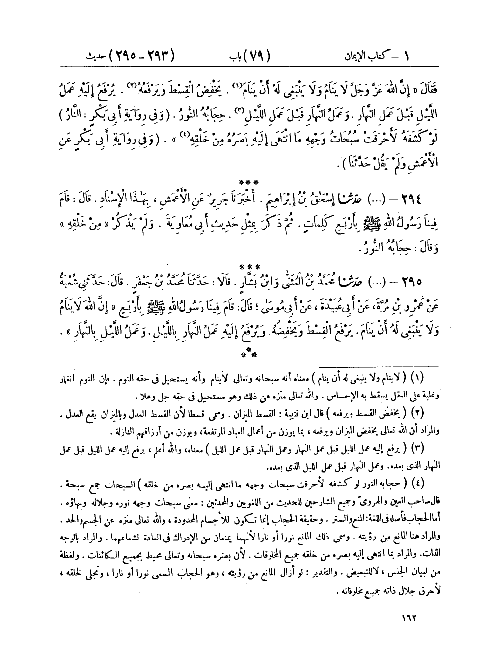 ٢٩٥ - (١٧٩) حَدَّثَنَا مُحَمَّدُ بْنُ الْمُثَنَّى، وَابْنُ بَشَّارٍ، قَالَا: حَدَّثَنَا مُحَمَّدُ بْنُ جَعْفَرٍ، قَالَ: حَدَّثَنِي شُعْبَةُ، عَنْ عَمْرِو بْنِ مُرَّةَ، عَنْ أَبِي عُبَيْدَةَ، عَنْ أَبِي مُوسَى، قَالَ: قَامَ فِينَا رَسُولُ اللهِ صَلَّى اللهُ عَلَيْهِ وَسَلَّمَ بِأَرْبَعٍ: «إِنَّ اللهَ لَا يَنَامُ وَلَا يَنْبَغِي لَهُ أَنْ يَنَامَ، يَرْفَعُ الْقِسْطَ وَيَخْفِضُهُ، وَيُرْفَعُ إِلَيْهِ عَمَلُ النَّهَارِ بِاللَّيْلِ، وَعَمَلُ اللَّيْلِ بِالنَّهَارِ»