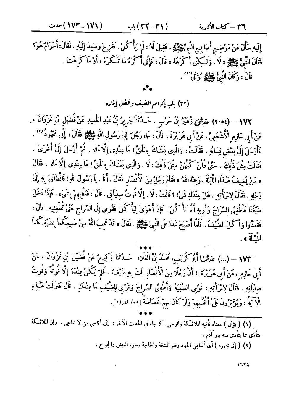 ١٧٢ - (٢٠٥٤) حَدَّثَنِي زُهَيْرُ بْنُ حَرْبٍ، حَدَّثَنَا جَرِيرُ بْنُ عَبْدِ الْحَمِيدِ، عَنْ فُضَيْلِ بْنِ غَزْوَانَ، عَنْ أَبِي حَازِمٍ الْأَشْجَعِيِّ، عَنْ أَبِي هُرَيْرَةَ، قَالَ: جَاءَ رَجُلٌ إِلَى رَسُولِ اللهِ صَلَّى اللهُ عَلَيْهِ وَسَلَّمَ، فَقَالَ: إِنِّي مَجْهُودٌ، فَأَرْسَلَ إِلَى بَعْضِ نِسَائِهِ، فَقَالَتْ: وَالَّذِي بَعَثَكَ بِالْحَقِّ، مَا عِنْدِي إِلَّا مَاءٌ، ثُمَّ أَرْسَلَ إِلَى أُخْرَى، فَقَالَتْ مِثْلَ ذَلِكَ، حَتَّى قُلْنَ كُلُّهُنَّ مِثْلَ ذَلِكَ: لَا، وَالَّذِي بَعَثَكَ بِالْحَقِّ، مَا عِنْدِي إِلَّا مَاءٌ، فَقَالَ: «مَنْ يُضِيفُ هَذَا اللَّيْلَةَ رَحِمَهُ اللهُ؟»، فَقَامَ رَجُلٌ مِنَ الْأَنْصَارِ، فَقَالَ: أَنَا، يَا رَسُولَ اللهِ، فَانْطَلَقَ بِهِ إِلَى رَحْلِهِ، فَقَالَ لِامْرَأَتِهِ: هَلْ عِنْدَكِ شَيْءٌ؟ قَالَتْ: لَا إِلَّا قُوتُ صِبْيَانِي، قَالَ: فَعَلِّلِيهِمْ بِشَيْءٍ، فَإِذَا دَخَلَ ضَيْفُنَا فَأَطْفِئِ السِّرَاجَ، وَأَرِيهِ أَنَّا نَأْكُلُ، فَإِذَا أَهْوَى لِيَأْكُلَ، فَقُومِي إِلَى السِّرَاجِ حَتَّى تُطْفِئِيهِ، قَالَ: فَقَعَدُوا وَأَكَلَ الضَّيْفُ، فَلَمَّا أَصْبَحَ غَدَا عَلَى النَّبِيِّ صَلَّى اللهُ عَلَيْهِ وَسَلَّمَ، فَقَالَ: «قَدْ عَجِبَ اللهُ مِنْ صَنِيعِكُمَا بِضَيْفِكُمَا اللَّيْلَةَ»