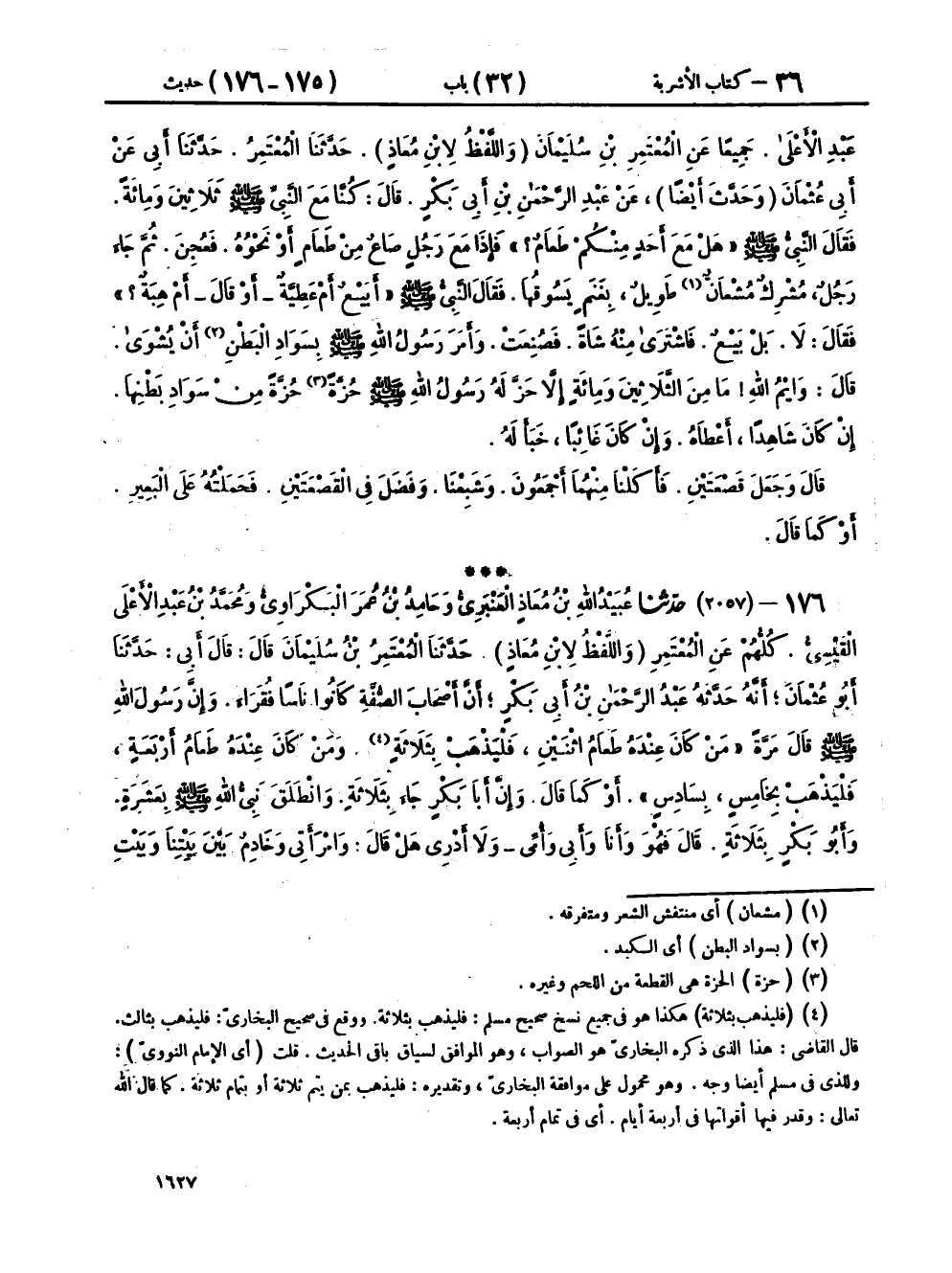 ١٧٦ - (٢٠٥٧) حَدَّثَنَا عُبَيْدُ اللهِ بْنُ مُعَاذٍ الْعَنْبَرِيُّ، وَحَامِدُ بْنُ عُمَرَ الْبَكْرَاوِيُّ، وَمُحَمَّدُ بْنُ عَبْدِ الْأَعْلَى الْقَيْسِيُّ، كُلُّهُمْ عَنِ الْمُعْتَمِرِ، وَاللَّفْظُ لِابْنِ مُعَاذٍ، حَدَّثَنَا الْمُعْتَمِرُ بْنُ سُلَيْمَانَ، قَالَ: قَالَ أَبِي، حَدَّثَنَا أَبُو عُثْمَانَ، أَنَّهُ حَدَّثَهُ عَبْدُ الرَّحْمَنِ بْنُ أَبِي بَكْرٍ، أَنَّ أَصْحَابَ الصُّفَّةِ، كَانُوا نَاسًا فُقَرَاءَ، وَإِنَّ رَسُولَ اللهِ صَلَّى اللهُ عَلَيْهِ وَسَلَّمَ، قَالَ مَرَّةً: «مَنْ كَانَ عِنْدَهُ طَعَامُ اثْنَيْنِ فَلْيَذْهَبْ بِثَلَاثَةٍ، وَمَنْ كَانَ عِنْدَهُ طَعَامُ أَرْبَعَةٍ فَلْيَذْهَبْ بِخَامِسٍ، بِسَادِسٍ» أَوْ كَمَا قَالَ: وَإِنَّ أَبَا بَكْرٍ جَاءَ بِثَلَاثَةٍ، وَانْطَلَقَ نَبِيُّ اللهِ صَلَّى اللهُ عَلَيْهِ وَسَلَّمَ بِعَشَرَةٍ، وَأَبُو بَكْرٍ بِثَلَاثَةٍ، قَالَ: فَهُوَ وَأَنَا وَأَبِي وَأُمِّي - وَلَا أَدْرِي هَلْ قَالَ: وَامْرَأَتِي وَخَادِمٌ بَيْنَ بَيْتِنَا وَبَيْتِ أَبِي بَكْرٍ - قَالَ: وَإِنَّ أَبَا بَكْرٍ تَعَشَّى عِنْدَ النَّبِيِّ صَلَّى اللهُ عَلَيْهِ وَسَلَّمَ، ثُمَّ لَبِثَ حَتَّى صُلِّيَتِ الْعِشَاءُ، ثُمَّ رَجَعَ، فَلَبِثَ حَتَّى نَعَسَ رَسُولُ اللهِ صَلَّى اللهُ عَلَيْهِ وَسَلَّمَ، فَجَاءَ بَعْدَمَا مَضَى مِنَ اللَّيْلِ مَا شَاءَ اللهُ، قَالَتْ لَهُ امْرَأَتُهُ: مَا حَبَسَكَ عَنْ أَضْيَافِكَ - أَو قَالَتْ: ضَيْفِكَ؟ - قَالَ: أَوَ مَا عَشَّيْتِهِمْ؟ قَالَتْ: أَبَوْا حَتَّى تَجِيءَ، قَدْ عَرَضُوا عَلَيْهِمْ فَغَلَبُوهُمْ، قَالَ: فَذَهَبْتُ أَنَا فَاخْتَبَأْتُ، وَقَالَ: يَا غُنْثَرُ، فَجَدَّعَ وَسَبَّ، وَقَالَ: كُلُوا لَا هَنِيئًا، وَقَالَ: وَاللهِ لَا أَطْعَمُهُ أَبَدًا، قَالَ: فَايْمُ اللهِ، مَا كُنَّا نَأْخُذُ مِنْ لُقْمَةٍ إِلَّا رَبَا مِنْ أَسْفَلِهَا أَكْثَرَ مِنْهَا، قَالَ: حَتَّى شَبِعْنَا وَصَارَتْ أَكْثَرَ مِمَّا كَانَتْ قَبْلَ ذَلِكَ، فَنَظَرَ إِلَيْهَا أَبُو بَكْرٍ فَإِذَا هِيَ كَمَا هِيَ أَوْ أَكْثَرُ، قَالَ لِامْرَأَتِهِ: يَا أُخْتَ بَنِي فِرَاسٍ مَا هَذَا؟ قَالَتْ: لَا وَقُرَّةِ عَيْنِي، لَهِيَ الْآنَ أَكْثَرُ مِنْهَا قَبْلَ ذَلِكَ بِثَلَاثِ مِرَارٍ، قَالَ: فَأَكَلَ مِنْهَا أَبُو بَكْرٍ، وَقَالَ: إِنَّمَا كَانَ ذَلِكَ مِنَ الشَّيْطَانِ يَعْنِي يَمِينَهُ، ثُمَّ أَكَلَ مِنْهَا لُقْمَةً، ثُمَّ حَمَلَهَا إِلَى رَسُولِ اللهِ صَلَّى اللهُ عَلَيْهِ وَسَلَّمَ، فَأَصْبَحَتْ عِنْدَهُ، قَالَ: وَكَانَ بَيْنَنَا وَبَيْنَ قَوْمٍ عَقْدٌ، فَمَضَى الْأَجَلُ فَعَرَّفْنَا اثْنَا عَشَرَ رَجُلًا مَعَ كُلِّ رَجُلٍ مِنْهُمْ أُنَاسٌ اللهُ أَعْلَمُ كَمْ مَعَ كُلِّ رَجُلٍ، إِلَّا أَنَّهُ بَعَثَ مَعَهُمْ فَأَكَلُوا مِنْهَا أَجْمَعُونَ أَوْ كَمَا قَالَ