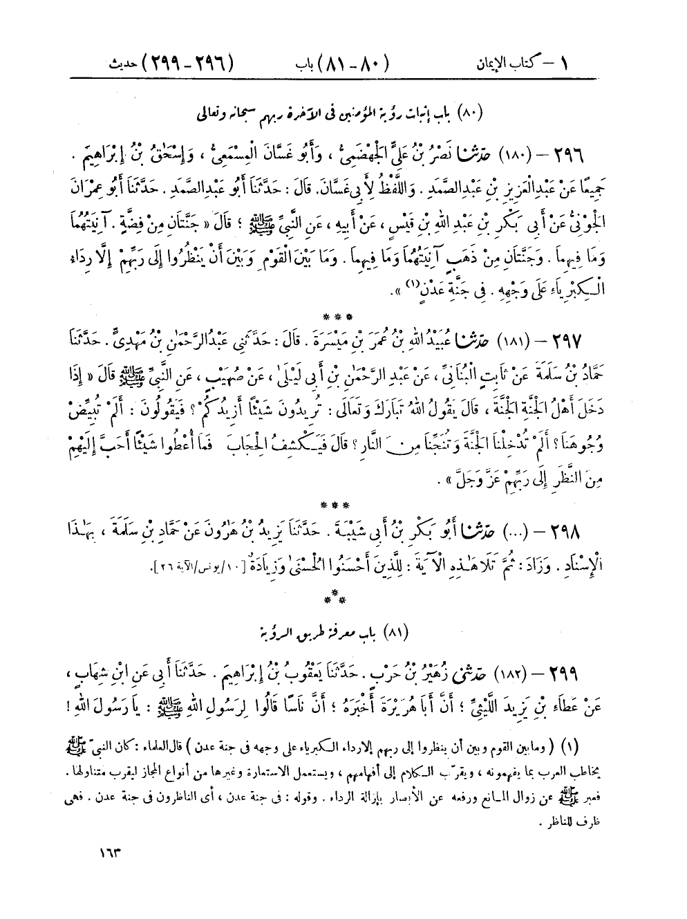 ٢٩٧ - (١٨١) حَدَّثَنَا عُبَيْدُ اللهِ بْنُ عُمَرَ بْنِ مَيْسَرَةَ، قَالَ: حَدَّثَنِي عَبْدُ الرَّحْمَنِ بْنُ مَهْدِيٍّ، حَدَّثَنَا حَمَّادُ بْنُ سَلَمَةَ، عَنْ ثَابِتٍ الْبُنَانِيِّ، عَنْ عَبْدِ الرَّحْمَنِ بْنِ أَبِي لَيْلَى، عَنْ صُهَيْبٍ، عَنِ النَّبِيِّ صَلَّى اللهُ عَلَيْهِ وَسَلَّمَ قَالَ: " إِذَا دَخَلَ أَهْلُ الْجَنَّةِ الْجَنَّةَ، قَالَ: يَقُولُ اللهُ تَبَارَكَ وَتَعَالَى: تُرِيدُونَ شَيْئًا أَزِيدُكُمْ؟ فَيَقُولُونَ: أَلَمْ تُبَيِّضْ وُجُوهَنَا؟ أَلَمْ تُدْخِلْنَا الْجَنَّةَ، وَتُنَجِّنَا مِنَ النَّارِ؟ قَالَ: فَيَكْشِفُ الْحِجَابَ، فَمَا أُعْطُوا شَيْئًا أَحَبَّ إِلَيْهِمْ مِنَ النَّظَرِ إِلَى رَبِّهِمْ عَزَّ وَجَلَّ "،