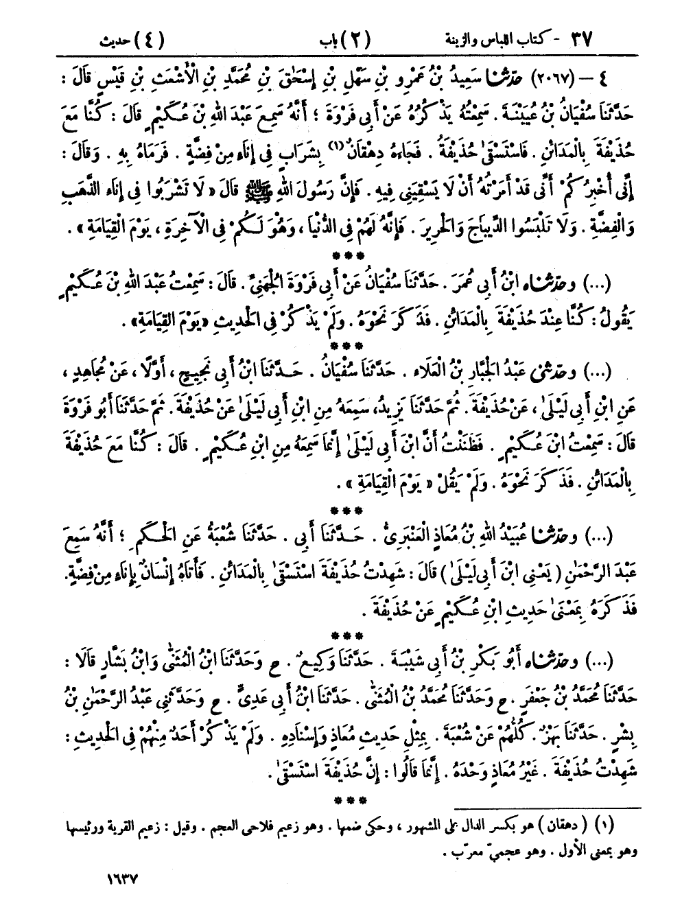 ٤ - (٢٠٦٧) حَدَّثَنَا سَعِيدُ بْنُ عَمْرِو بْنِ سَهْلِ بْنِ إِسْحَاقَ بْنِ مُحَمَّدِ بْنِ الْأَشْعَثِ بْنِ قَيْسٍ، قَالَ: حَدَّثَنَا سُفْيَانُ بْنُ عُيَيْنَةَ، سَمِعْتُهُ يَذْكُرُهُ، عَنْ أَبِي فَرْوَةَ، أَنَّهُ سَمِعَ عَبْدَ اللهِ بْنَ عُكَيْمٍ، قَالَ: كُنَّا مَعَ حُذَيْفَةَ بِالْمَدَائِنِ، فَاسْتَسْقَى حُذَيْفَةُ، فَجَاءَهُ دِهْقَانٌ بِشَرَابٍ فِي إِنَاءٍ مِنْ فِضَّةٍ فَرَمَاهُ بِهِ، وَقَالَ: إِنِّي أُخْبِرُكُمْ أَنِّي قَدْ أَمَرْتُهُ أَنْ لَا يَسْقِيَنِي فِيهِ، فَإِنَّ رَسُولَ اللهِ صَلَّى اللهُ عَلَيْهِ وَسَلَّمَ، قَالَ: «لَا تَشْرَبُوا فِي إِنَاءِ الذَّهَبِ وَالْفِضَّةِ، وَلَا تَلْبَسُوا الدِّيبَاجَ وَالْحَرِيرَ، فَإِنَّهُ لَهُمْ فِي الدُّنْيَا وَهُوَ لَكُمْ فِي الْآخِرَةِ يَوْمَ الْقِيَامَةِ»،