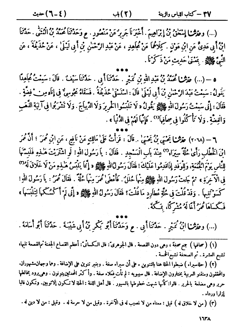 ٥ - (٢٠٦٧) حَدَّثَنَا مُحَمَّدُ بْنُ عَبْدِ اللهِ بْنِ نُمَيْرٍ، حَدَّثَنَا أَبِي، حَدَّثَنَا سَيْفٌ، قَالَ: سَمِعْتُ مُجَاهِدًا، يَقُولُ: سَمِعْتُ عَبْدَ الرَّحْمَنِ بْنَ أَبِي لَيْلَى، قَالَ: اسْتَسْقَى حُذَيْفَةُ، فَسَقَاهُ مَجُوسِيٌّ فِي إِنَاءٍ مِنْ فِضَّةٍ، فَقَالَ: إِنِّي سَمِعْتُ رَسُولَ اللهِ صَلَّى اللهُ عَلَيْهِ وَسَلَّمَ، يَقُولُ: «لَا تَلْبَسُوا الْحَرِيرَ وَلَا الدِّيبَاجَ، وَلَا تَشْرَبُوا فِي آنِيَةِ الذَّهَبِ وَالْفِضَّةِ، وَلَا تَأْكُلُوا فِي صِحَافِهَا، فَإِنَّهَا لَهُمْ فِي الدُّنْيَا»