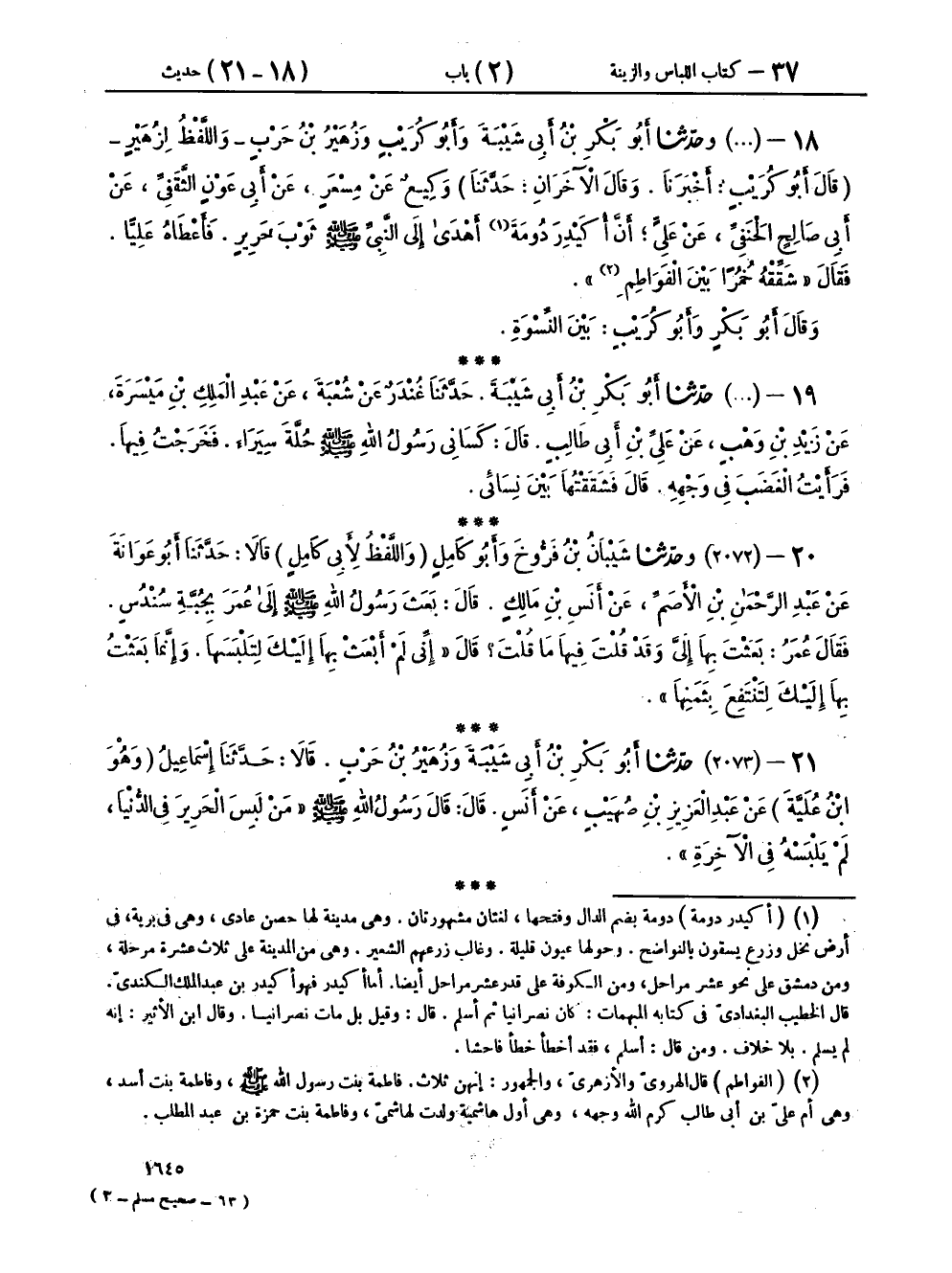 ١٨ - (٢٠٧١) وحَدَّثَنَا أَبُو بَكْرِ بْنُ أَبِي شَيْبَةَ، وَأَبُو كُرَيْبٍ، وَزُهَيْرُ بْنُ حَرْبٍ، وَاللَّفْظُ لِزُهَيْرٍ، قَالَ أَبُو كُرَيْبٍ: أَخْبَرَنَا، وقَالَ الْآخَرَانِ: حَدَّثَنَا وَكِيعٌ، عَنْ مِسْعَرٍ، عَنْ أَبِي عَوْنٍ الثَّقَفِيِّ، عَنْ أَبِي صَالِحٍ الْحَنَفِيِّ، عَنْ عَلِيٍّ، أَنَّ أُكَيْدِرَ دُومَةَ أَهْدَى إِلَى النَّبِيِّ صَلَّى اللهُ عَلَيْهِ وَسَلَّمَ ثَوْبَ حَرِيرٍ، فَأَعْطَاهُ عَلِيًّا، فَقَالَ: «شَقِّقْهُ خُمُرًا بَيْنَ الْفَوَاطِمِ»، وقَالَ أَبُو بَكْرٍ، وَأَبُو كُرَيْبٍ: «بَيْنَ النِّسْوَةِ»